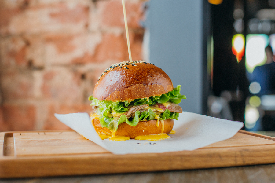 Стейк из говяжьей вырезки прожарки medium, булочка бриошь от Bakezavod, соус гриль, луковый конфитюр, салатные листья латук, соус чеддер.