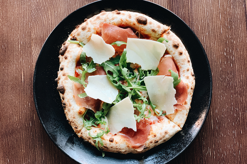 Выдержанное тесто, фирменный томатный соус, моцарелла, прошутто, грана падано, руккола, оливковое масло.