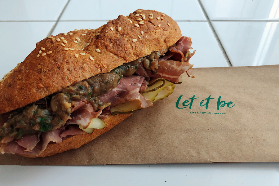 Луковый хлеб, пастрами ENZO, сливочный сыр, хрен, копчёный соус, икра из баклажана, маринованный огурец