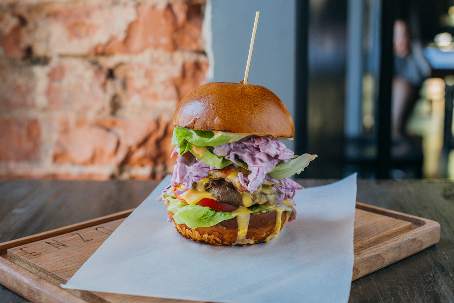 Котлета из 100%-ной говядины, булочка бриошь от BakeZavod, горчичный айоли, бекон обжаренный на гриле, салат коул слоу, салатные листья латук, свежий томат, красный лук, перец халапеньо, соус чеддер.