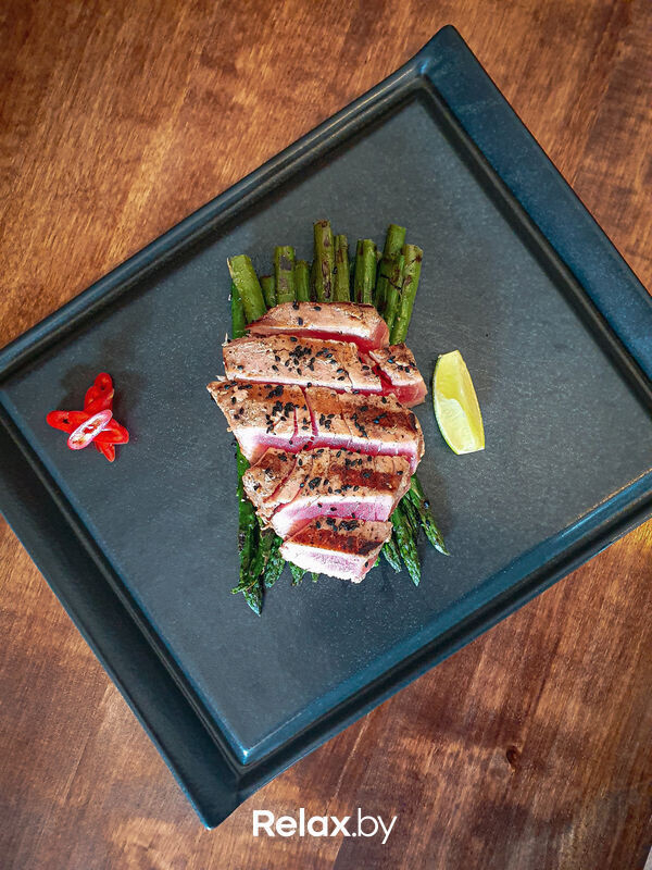 Желтоперый тунец в кунжуте, спаржа