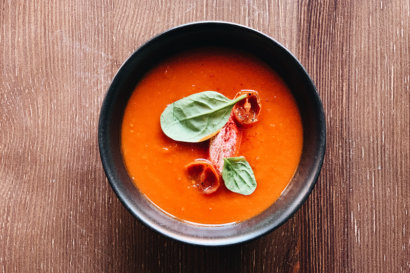 Томаты в собственном соку, лук, чеснок и перец перебиваются в однородную массу и дополняются вялеными томатами, копчёным творожным сыром и свекольной пылью
