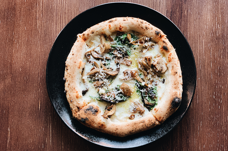 Выдержанное тесто, фирменный сливочный соус, моцарелла, вешенки, шампиньоны, козий сыр, трюфельное масло