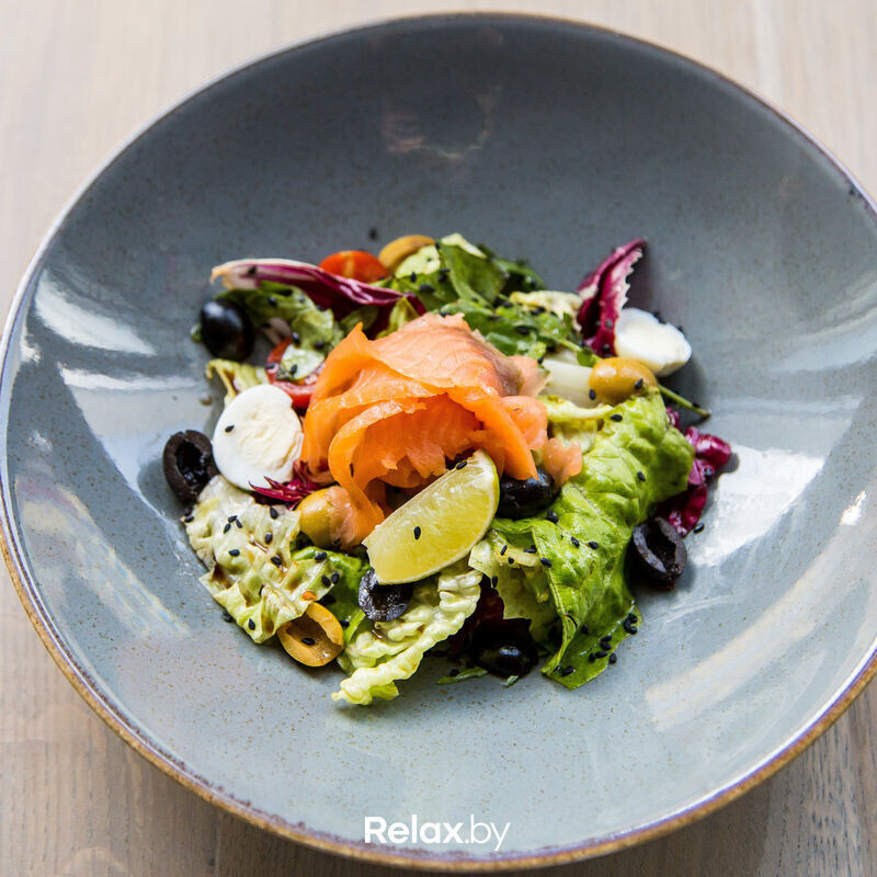 Лосось собственного копчения, обжаренный салат ромен, томаты черри, перепелиные яйца и оливки