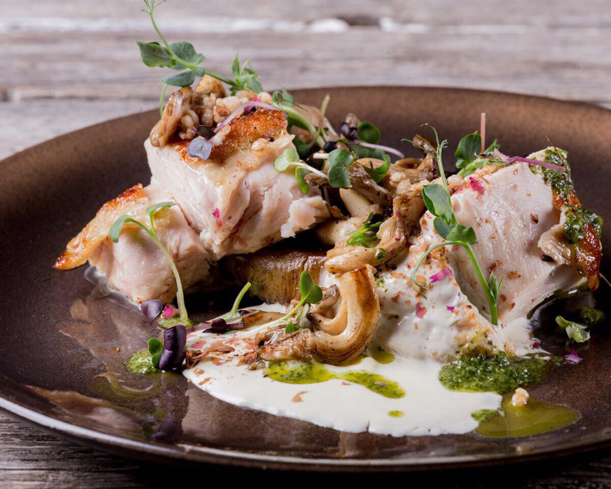 Томленое в сене куриное филе с жареными вешенками и картофелем (230/100/60/50/5)