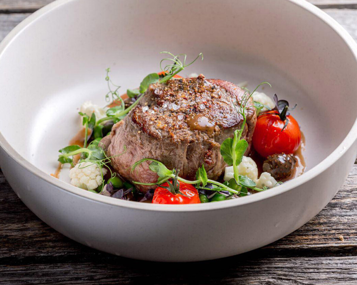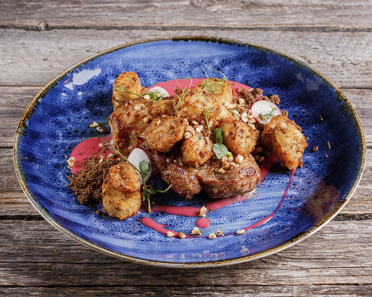 Стейк из говядины с соусом из сосновых шишек и кремом из пастернака (150/120/77)