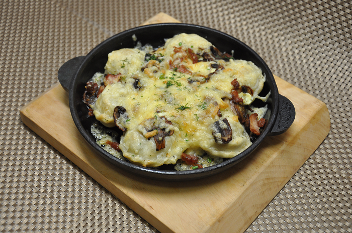 Состав: мука пшеничная высшего сорта, вода, картофель, шампиньоны, лук репчатый, масло растительное, соль, укроп.