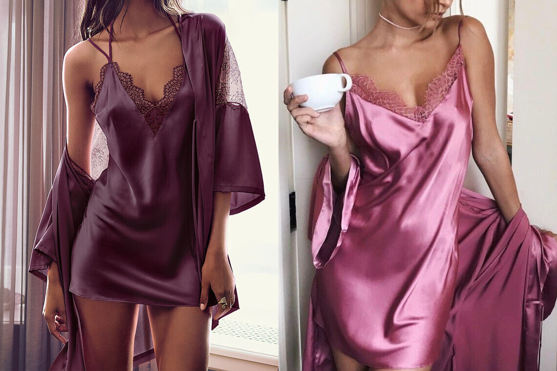 Такой вариант отлично сочетается с халатом-кимоно. Выглядит аккуратно, нежно и беспроигрышно на фоне стандартной домашней одежды. Не забываем про свободный крой: комфорт — в первую очередь.
