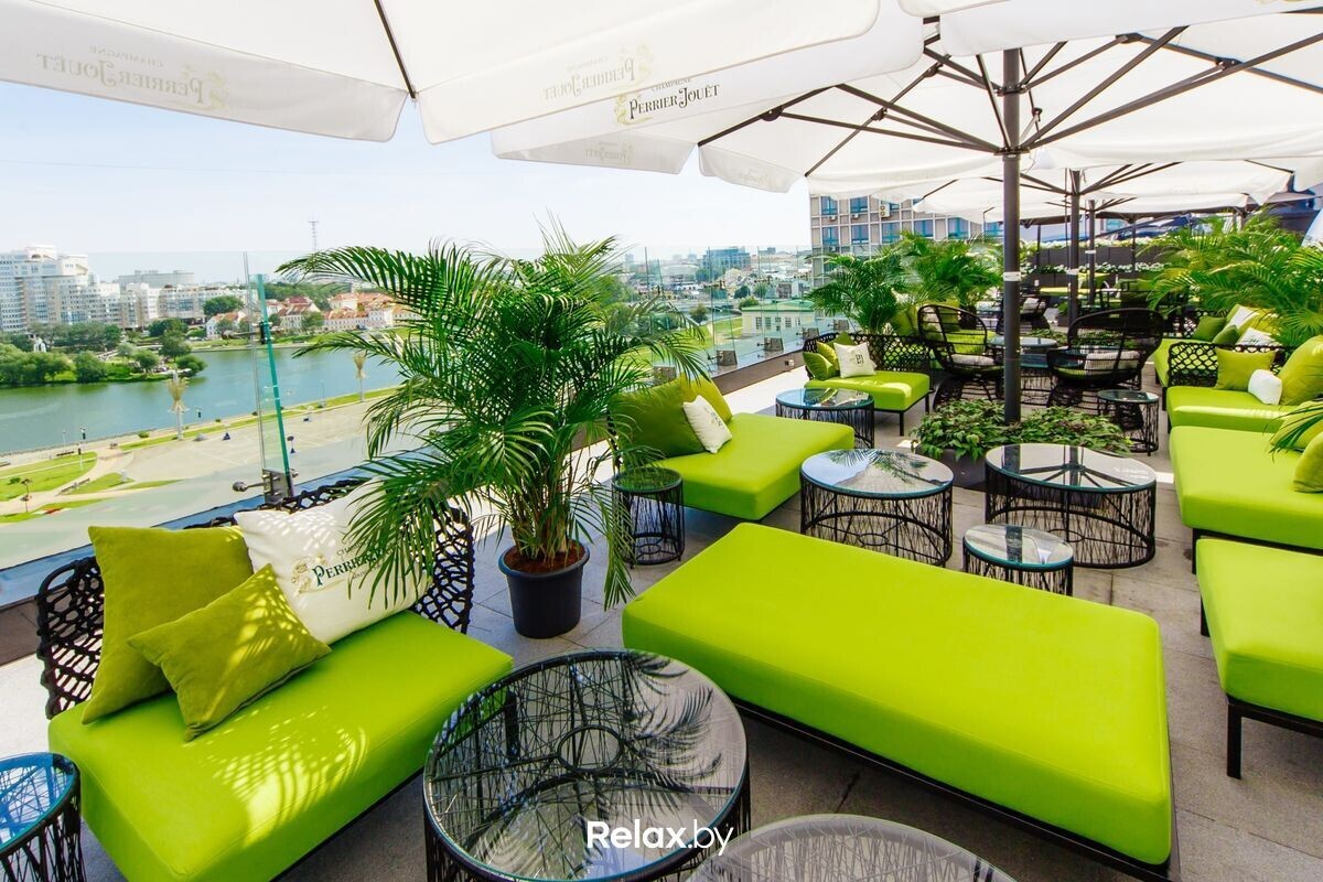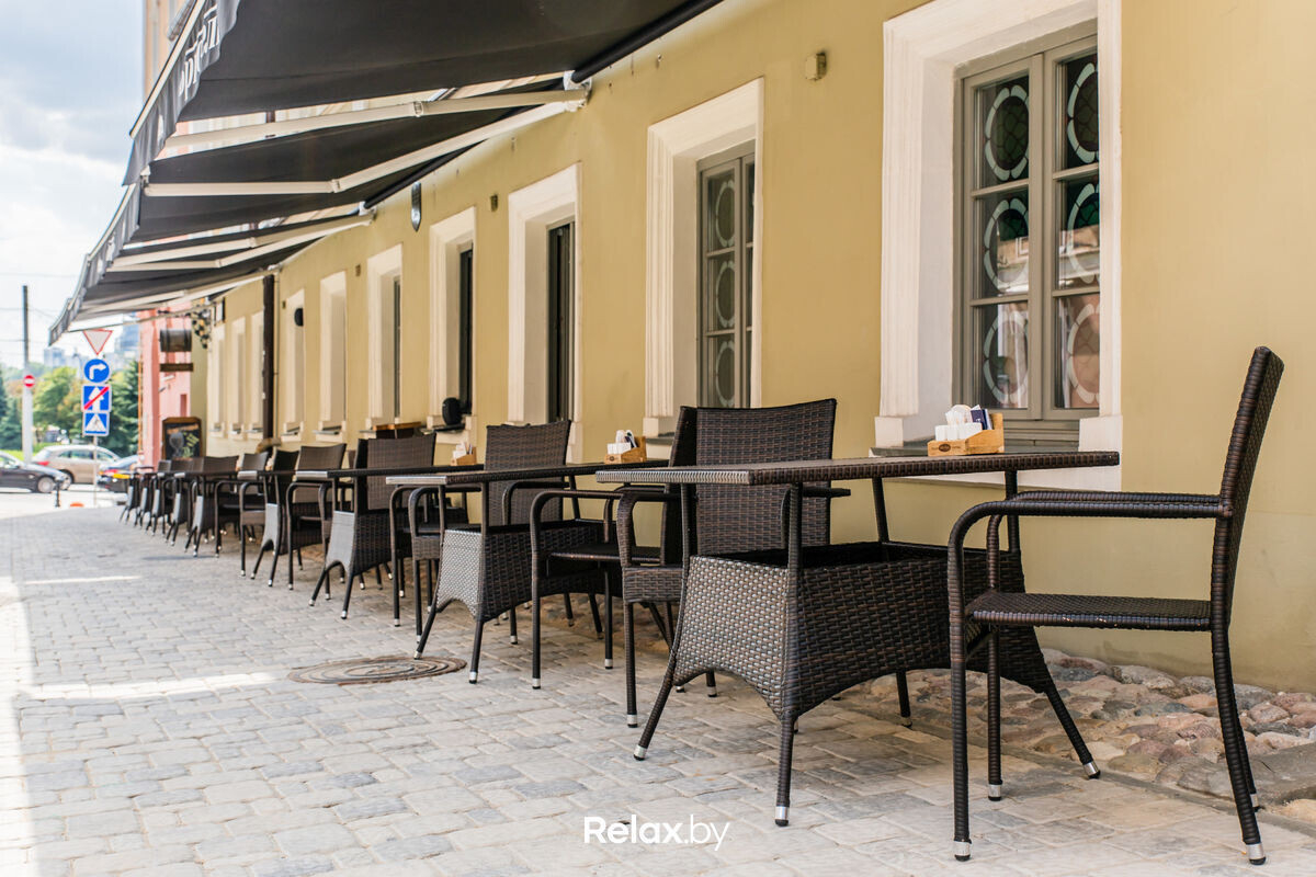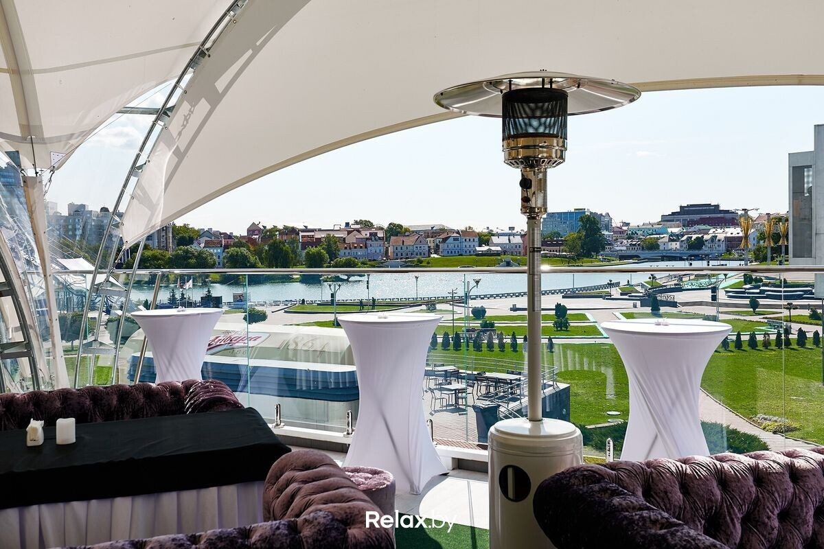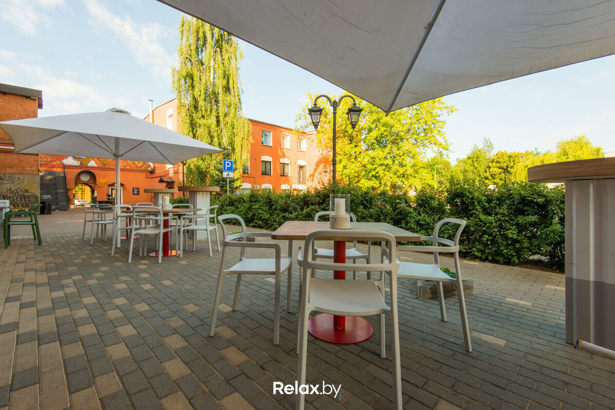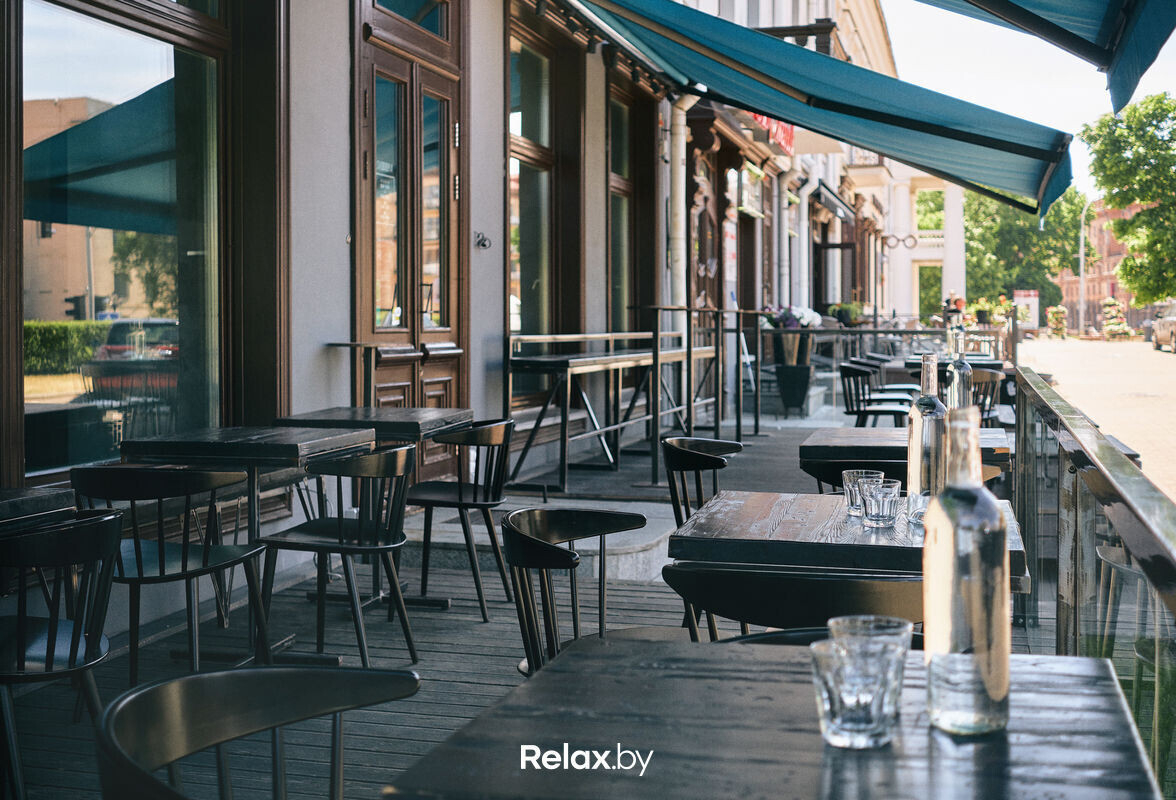 Терраса этого рестобара с авторской кухней также может похвастаться уникальной панорамой на исторический Минск. Зонирование на террасе позволяет не сидеть плотно друг к другу, идеально для небольших компаний. В разгар сезона обещают выступления кавер-бэндов и диджеев.