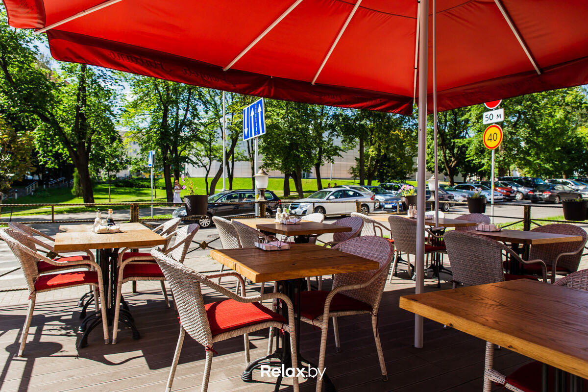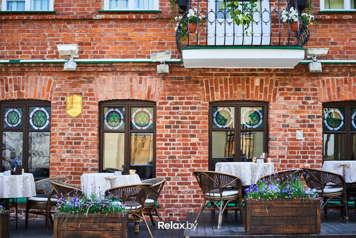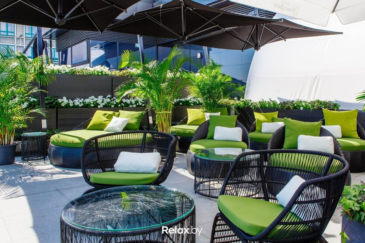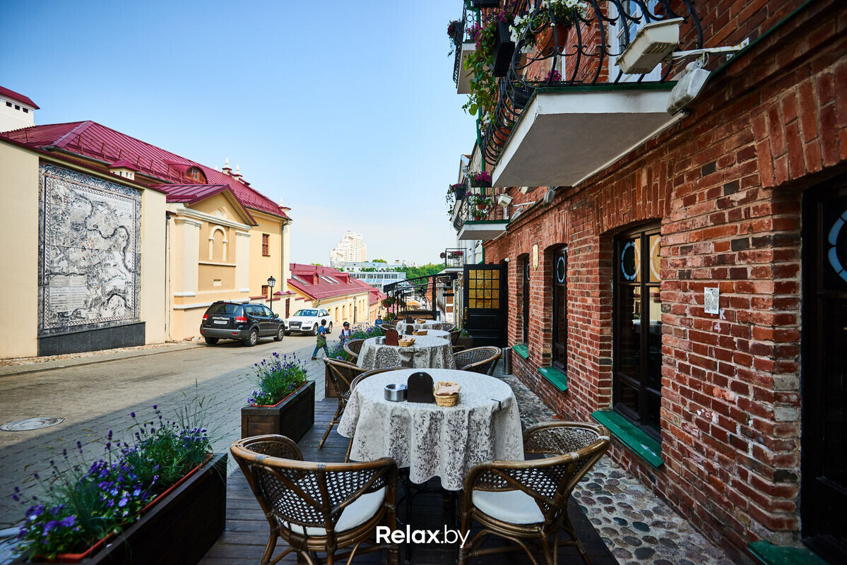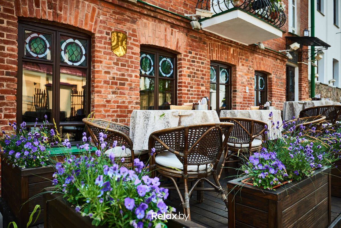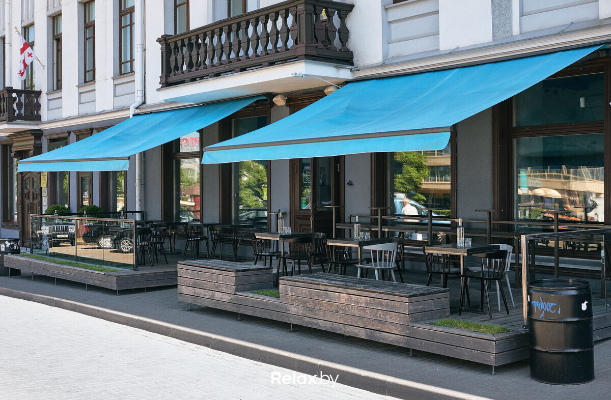 Терраса этого рестобара с авторской кухней также может похвастаться уникальной панорамой на исторический Минск. Зонирование на террасе позволяет не сидеть плотно друг к другу, идеально для небольших компаний. В разгар сезона обещают выступления кавер-бэндов и диджеев.