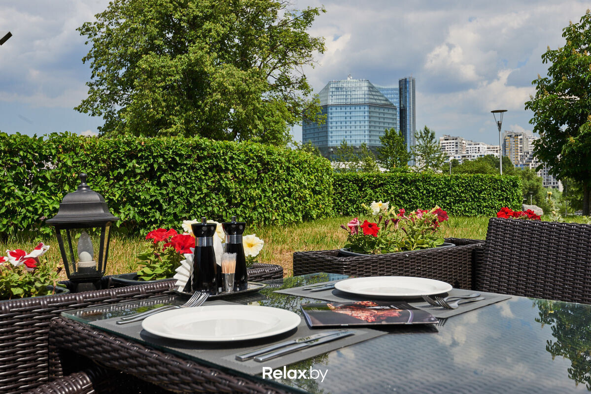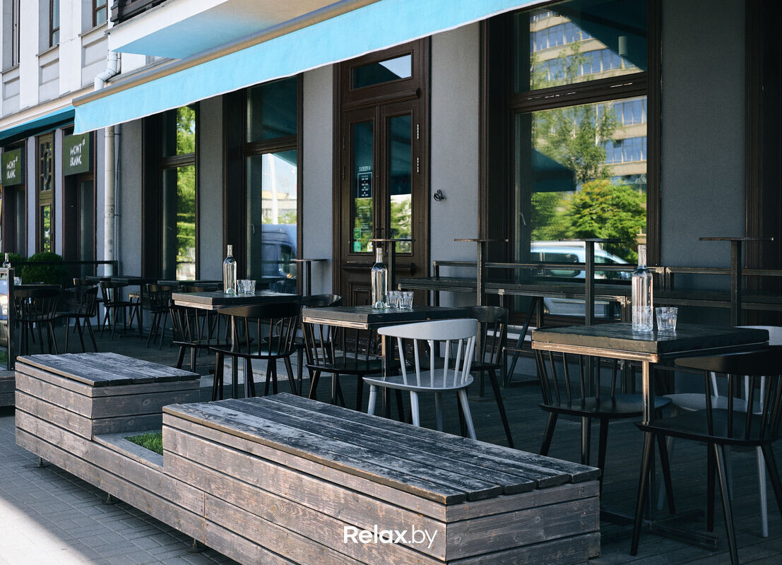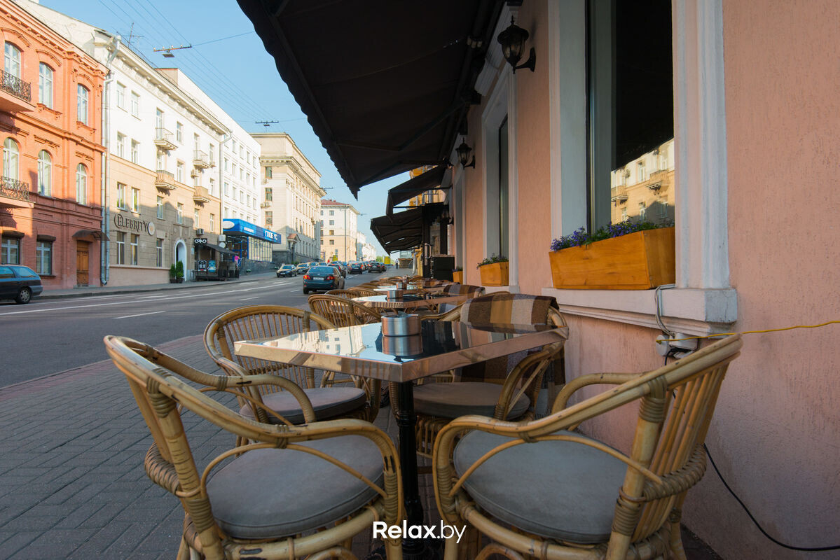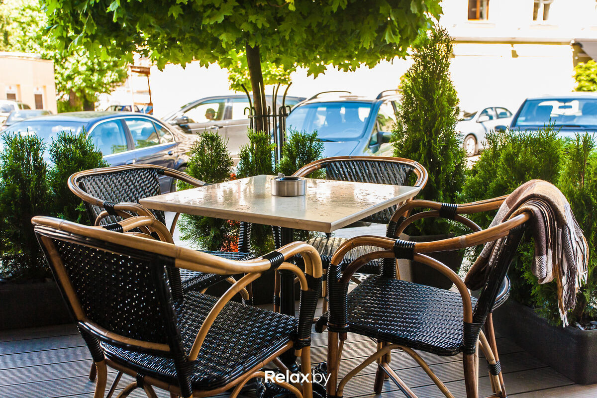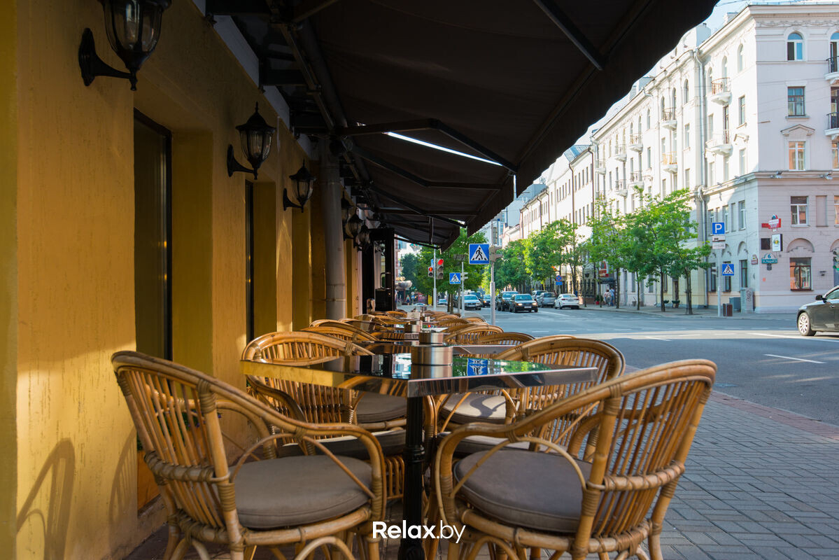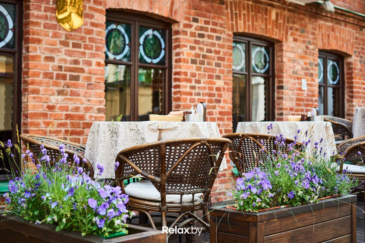 Терраса этого рестобара с авторской кухней также может похвастаться уникальной панорамой на исторический Минск. Зонирование на террасе позволяет не сидеть плотно друг к другу, идеально для небольших компаний. В разгар сезона обещают выступления кавер-бэндов и диджеев.