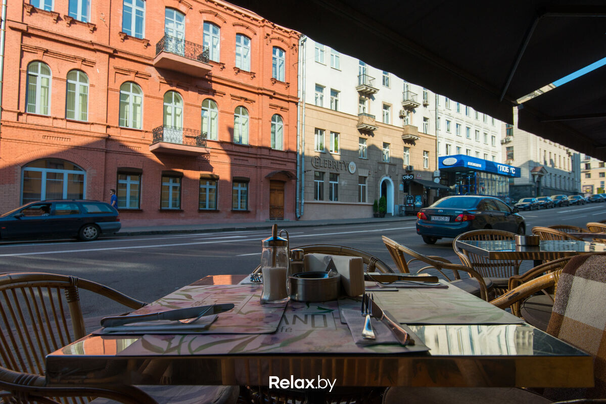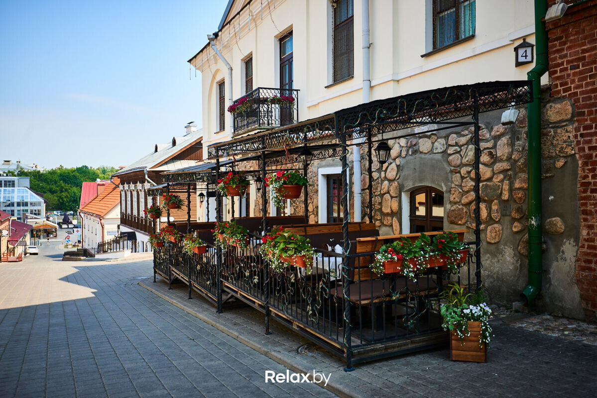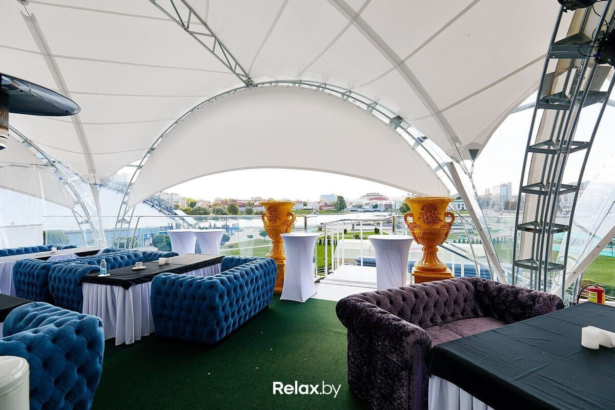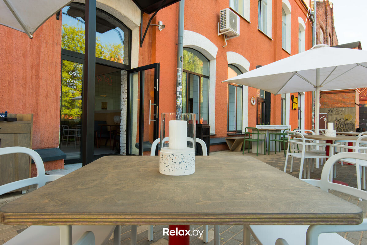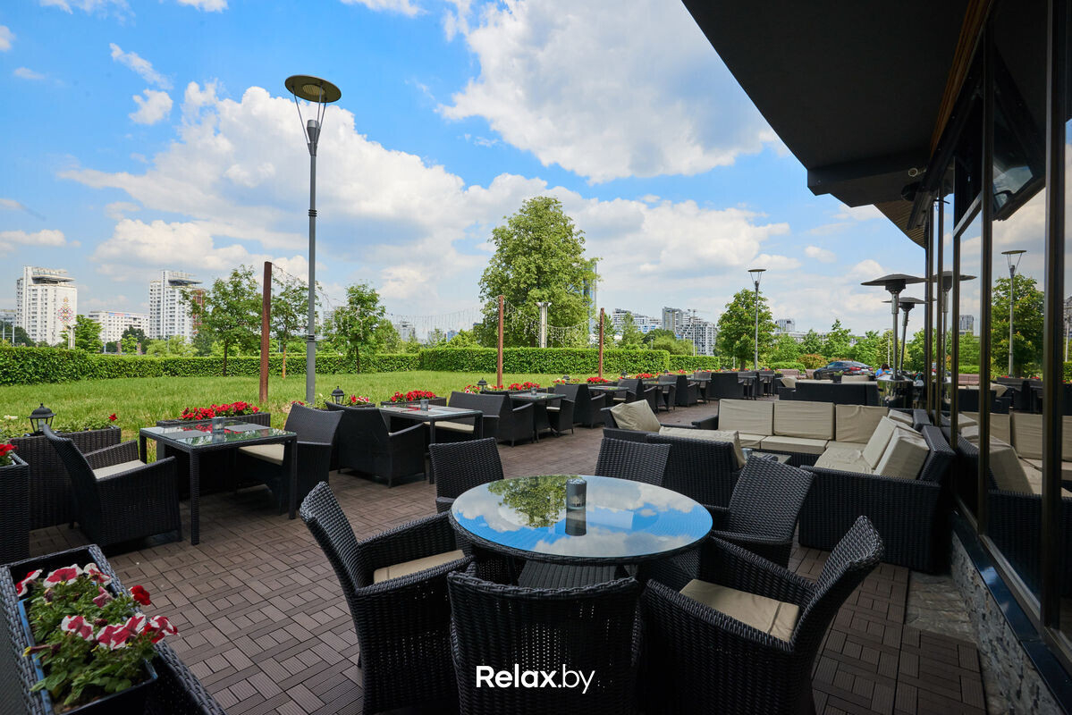 Терраса этого рестобара с авторской кухней также может похвастаться уникальной панорамой на исторический Минск. Зонирование на террасе позволяет не сидеть плотно друг к другу, идеально для небольших компаний. В разгар сезона обещают выступления кавер-бэндов и диджеев.