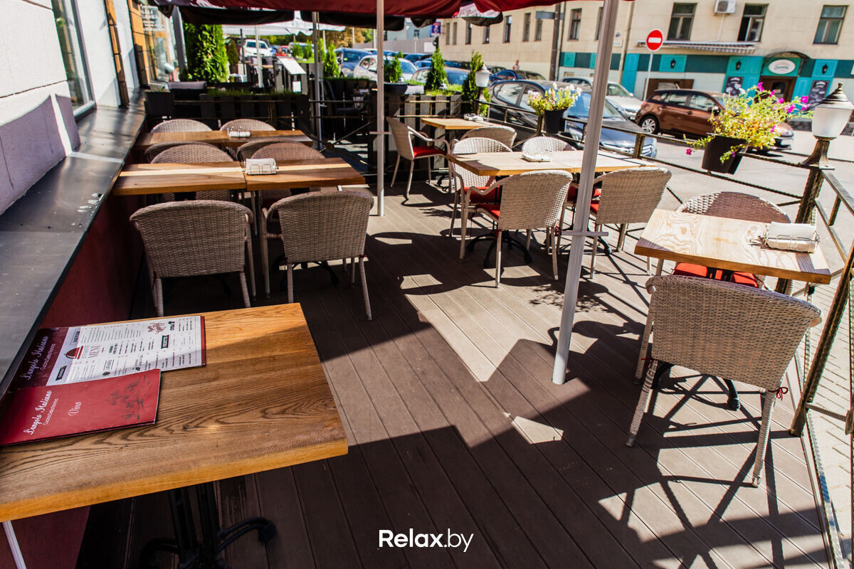Только зонт от солнца, свежий воздух и вид на уютную Раковскую. В этом итальянском ресторане терраса состоит из двух частей слева и справа от входа в ресторан. Сюда приходят за традиционной итальянской кухней, которую обязательно стоит дополнить лимонадом или домашним вином.