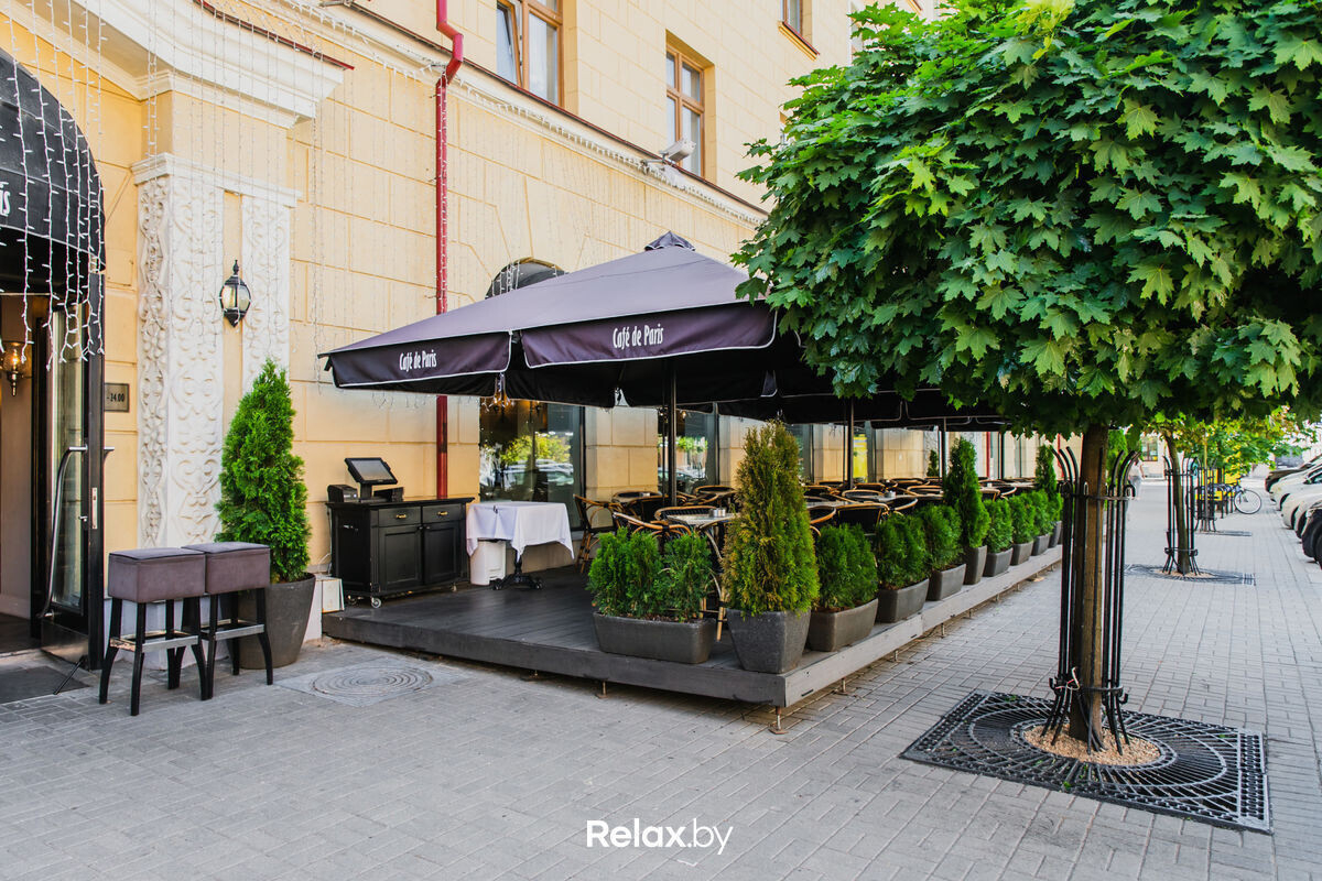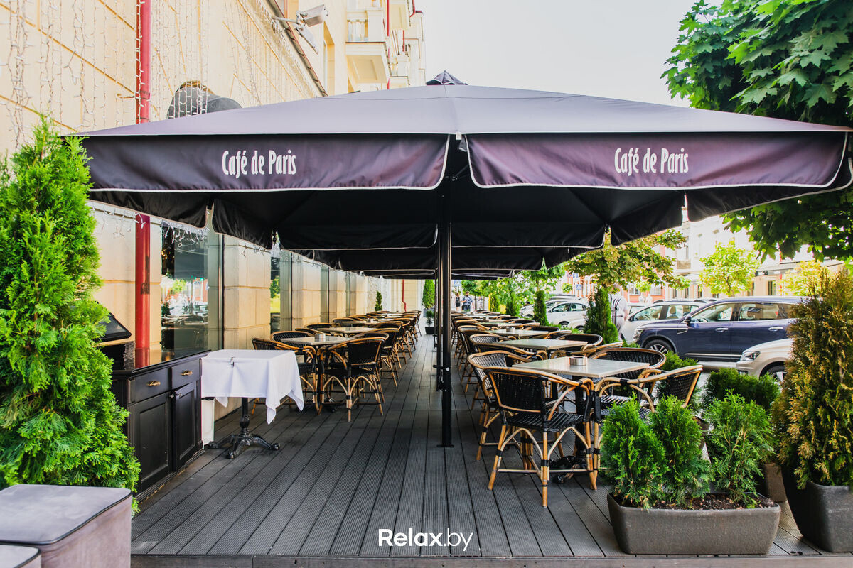 Cafe de Paris — ресторан европейской кухни на Карла Маркса от крупного холдинга, в который также входят Milano Café, кафе «Балкон» и Union Coffee. Заведение отличает меню от итальянского шеф-повара и элегантный интерьер. Терраса тоже удалась: плетеная мебель, стильная цветовая гамма, клетчатые пледы и европейское зонирование с помощью зелени.