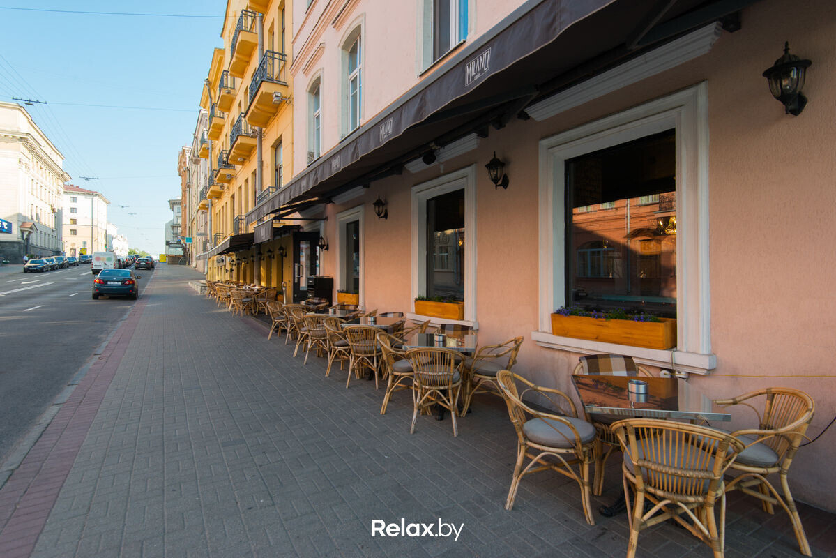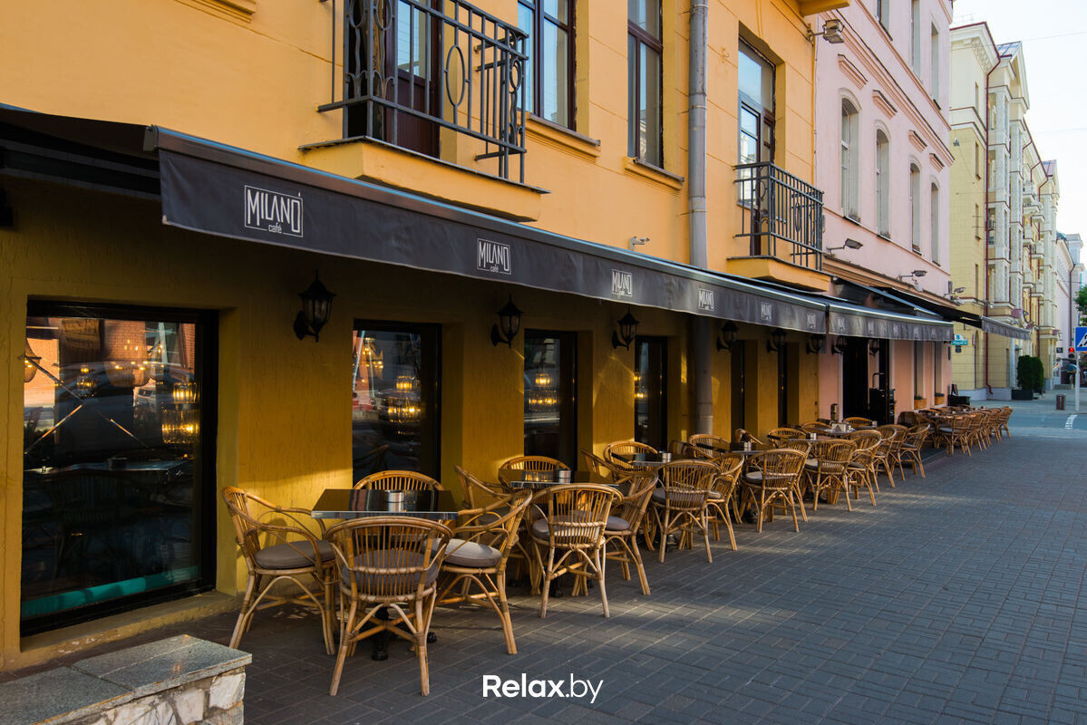 Если решите остаться в зале, то оцените интерьер Milano Café в современном стиле. Лаконичный дизайн подчеркивает обивка диванов цвета тиффани в сочетании с «серебром» столешниц и барной стойки. Но если погода позволяет, мы все же рекомендуем расположиться на летней террасе вдоль тротуара на пересечении улиц Маркса и Володарского. Она выполнена в европейском стиле с акцентом на мебель из ротанга. Вечером можно укутаться в клетчатый плед.