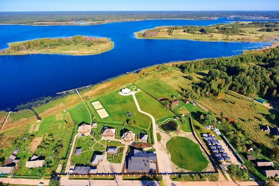 На берегу чистого лесного озера в хвойном лесу стоят уютные стильные двухэтажные домики с прилегающими террасами. Тут же — пирс и собственный пляж, ресторан со старобелорусской кухней, баня и даже VIP-коттедж.