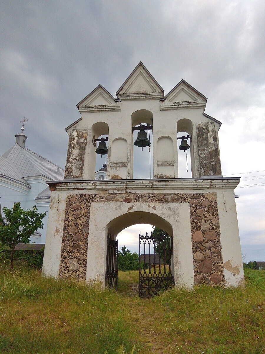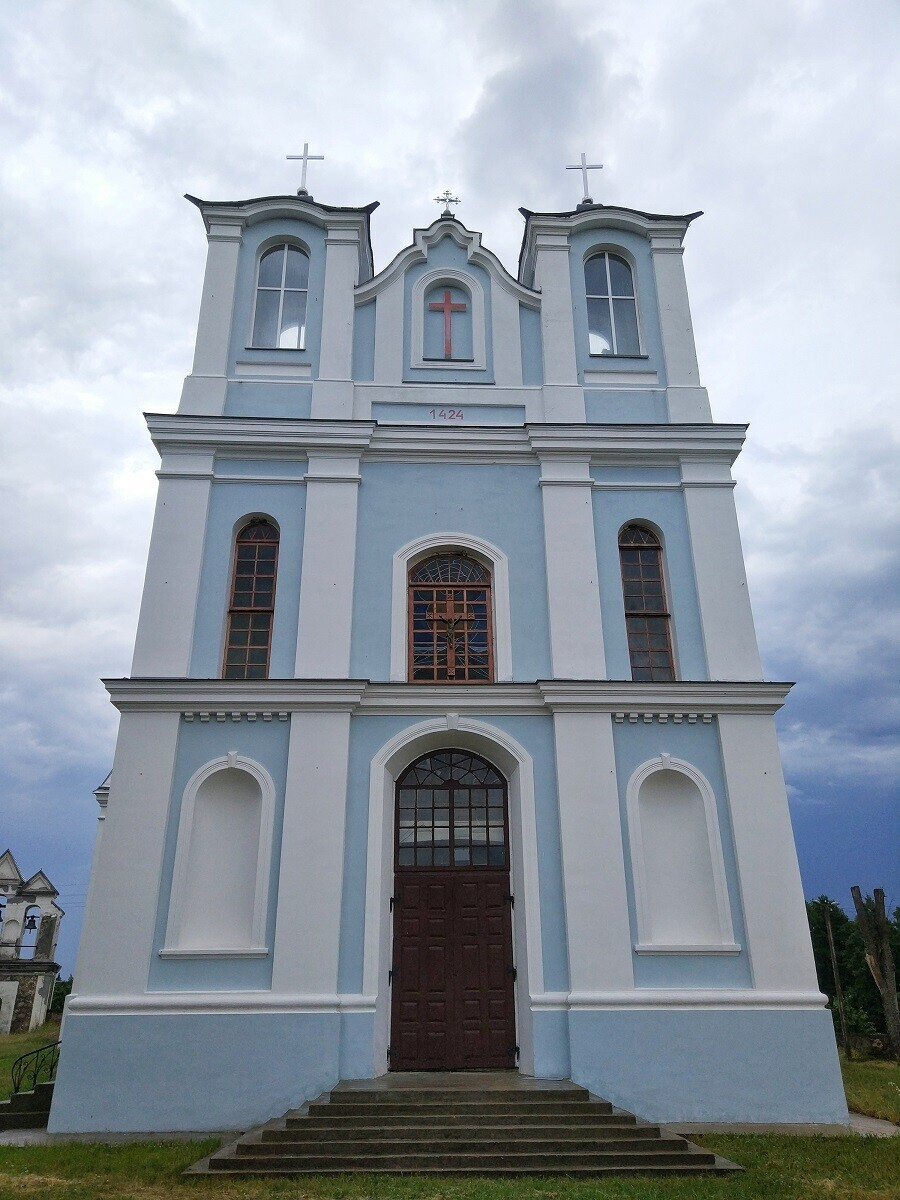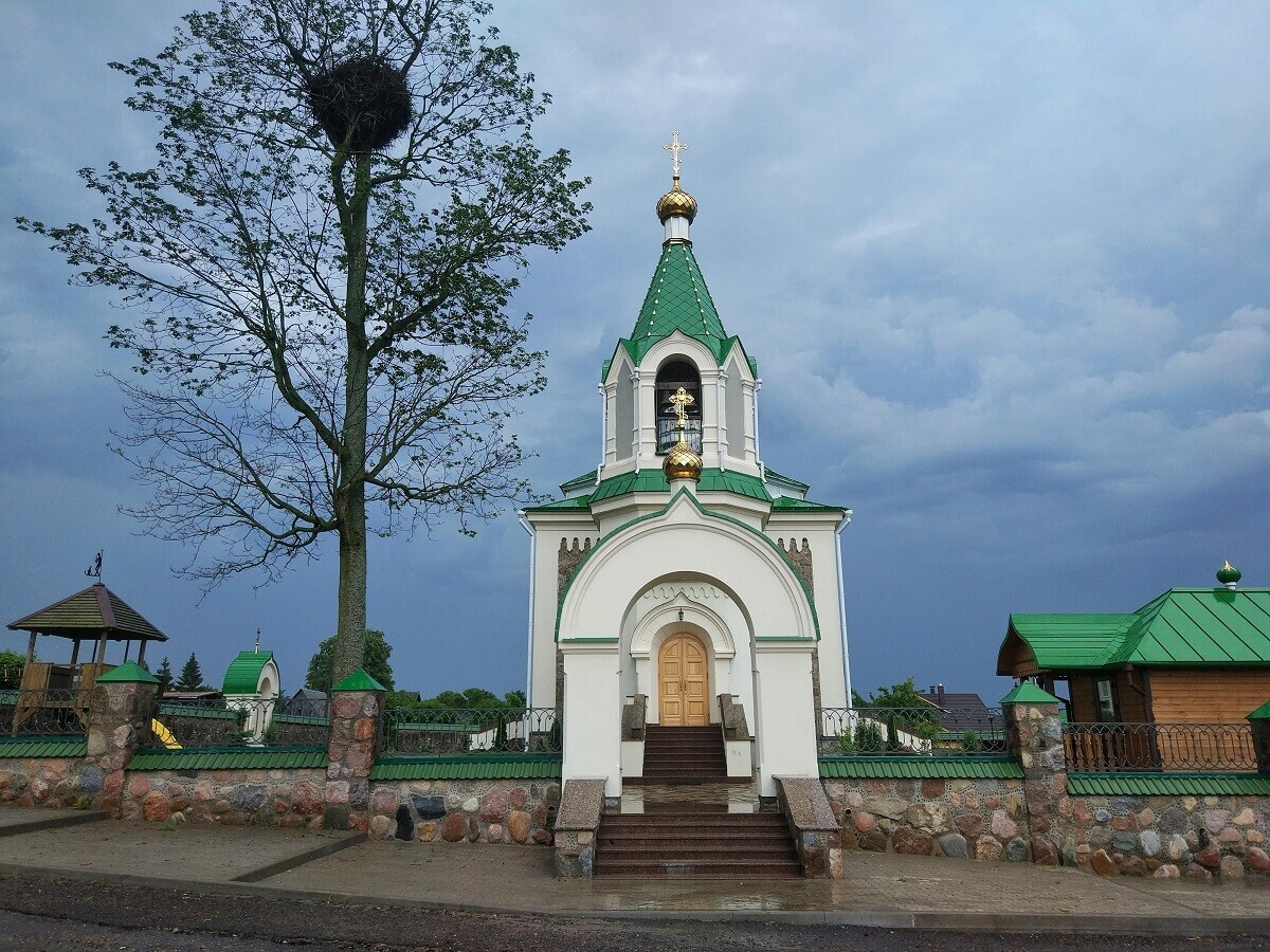 Напротив костела виднеются купола церкви святых Козьмы и Демьяна. Ее построили после восстания Кастуся Калиновского в 1865 году. Нарядная, веселая, с ухоженной территорией и огромным аистиным гнездом на дереве у входа, она также заслуживает вашего внимания.