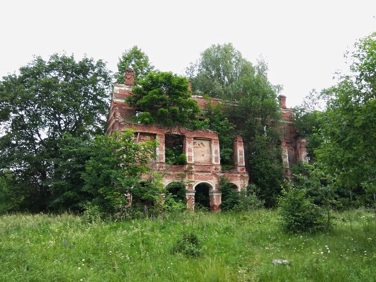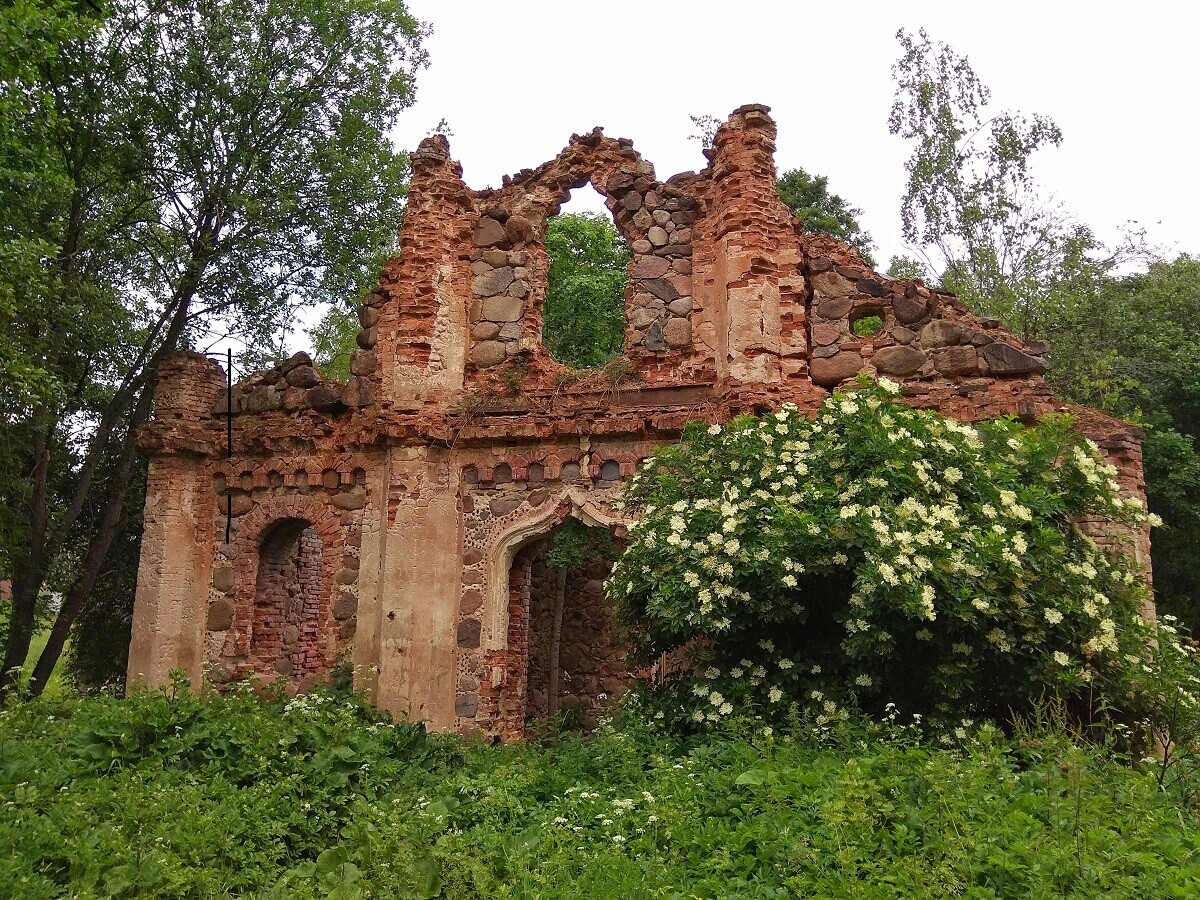 Сразу за санаторием открывается вид на охотничье имение Тышкевичей, вернее его руины: ажурное компактное здание из красного кирпича полускрыто шапкой проросших изнутри деревьев.