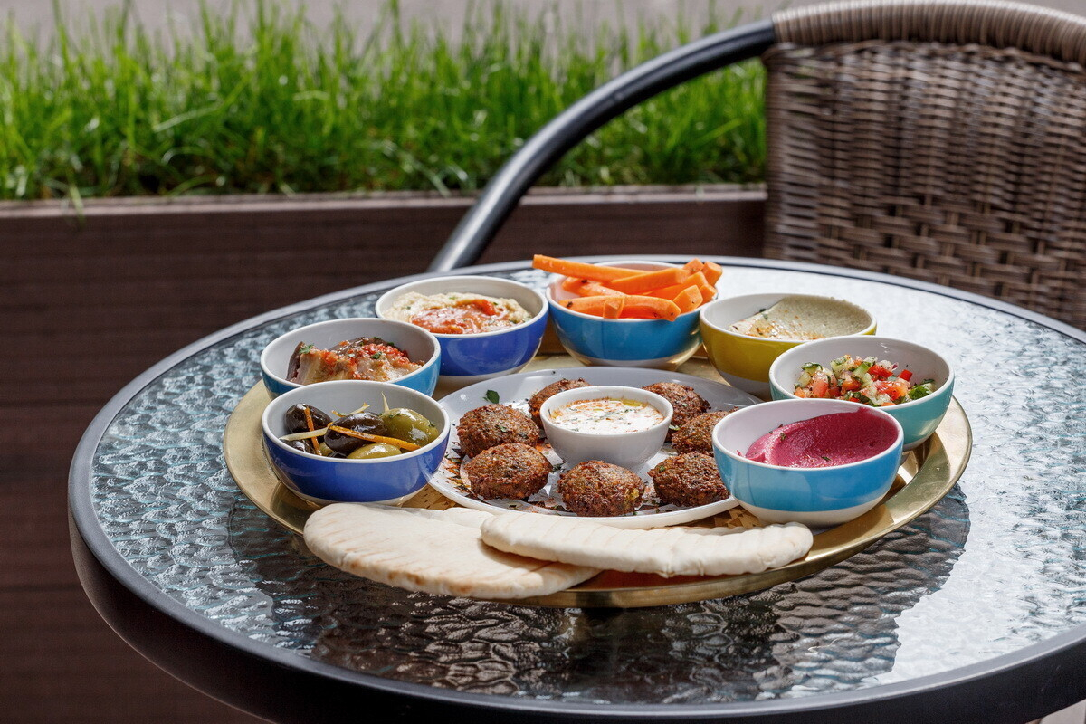 - Сет израильских закусок (хумус с матбухой, свекольный хумус, бабагануш, маринованный баклажан, свежий израильский салат, маринованные оливки и маслины, пряная домашняя морковь, фалафель с тхиной, две питы)