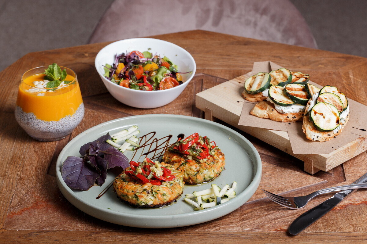 - Трио котлеток из нута, чечевицы и акары на подложке из хумусов с соусом песто. Подается со свежим салатом и печеными сезонными корнеплодами