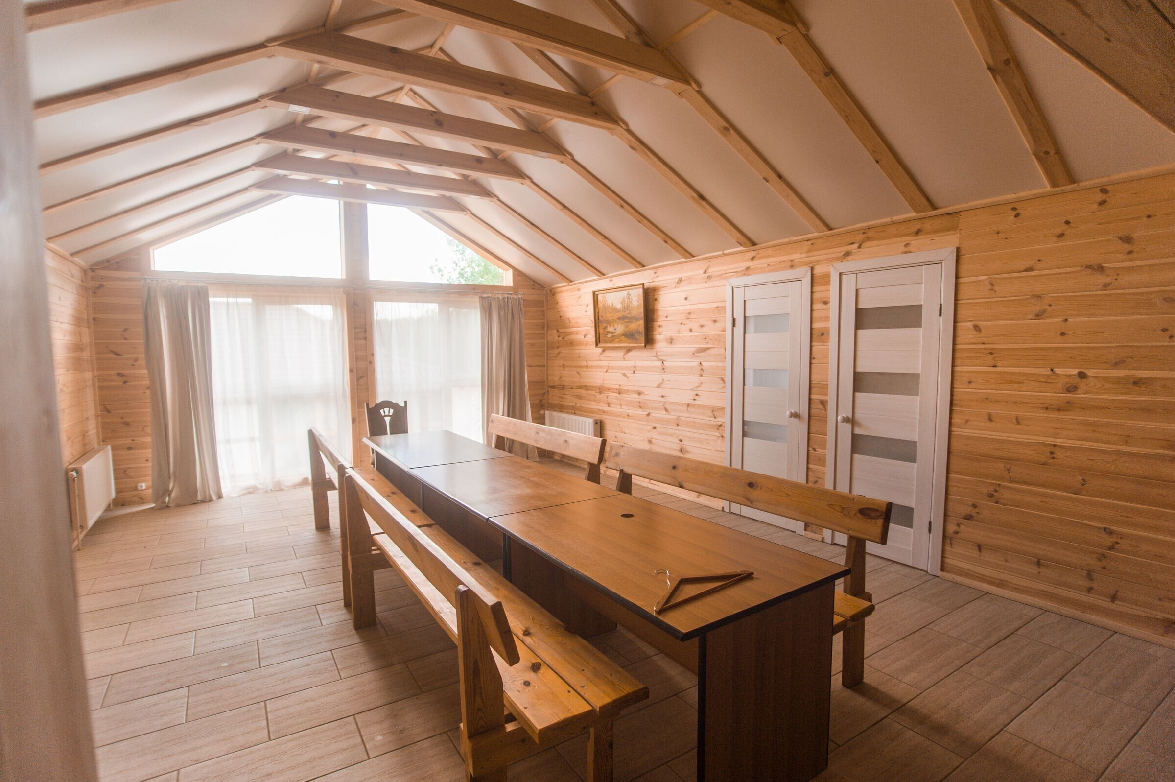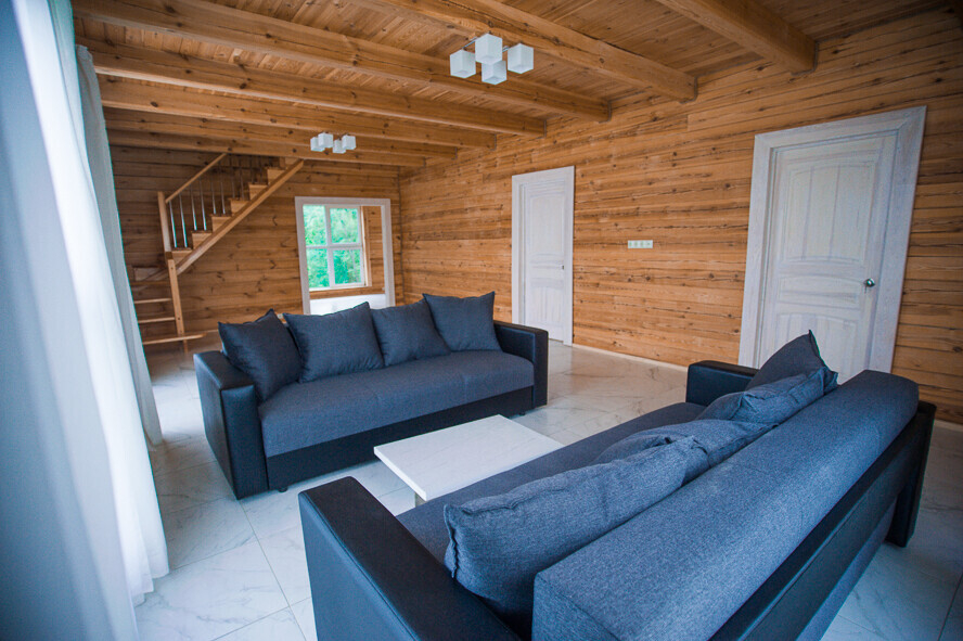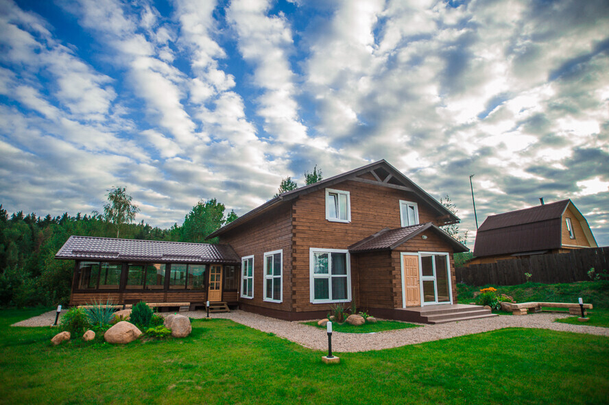 Жилые комнаты и номера со всеми удобствами готовы принять до 40 человек. Сосновый воздух, просторные террасы, оборудованные беседки с мангалами, лаунж-зона с декоративным прудом и аккуратной лужайкой обойдутся в 40 рублей с человека (в будние дни аренда дома стоит 400 рублей на компанию до 10 человек).