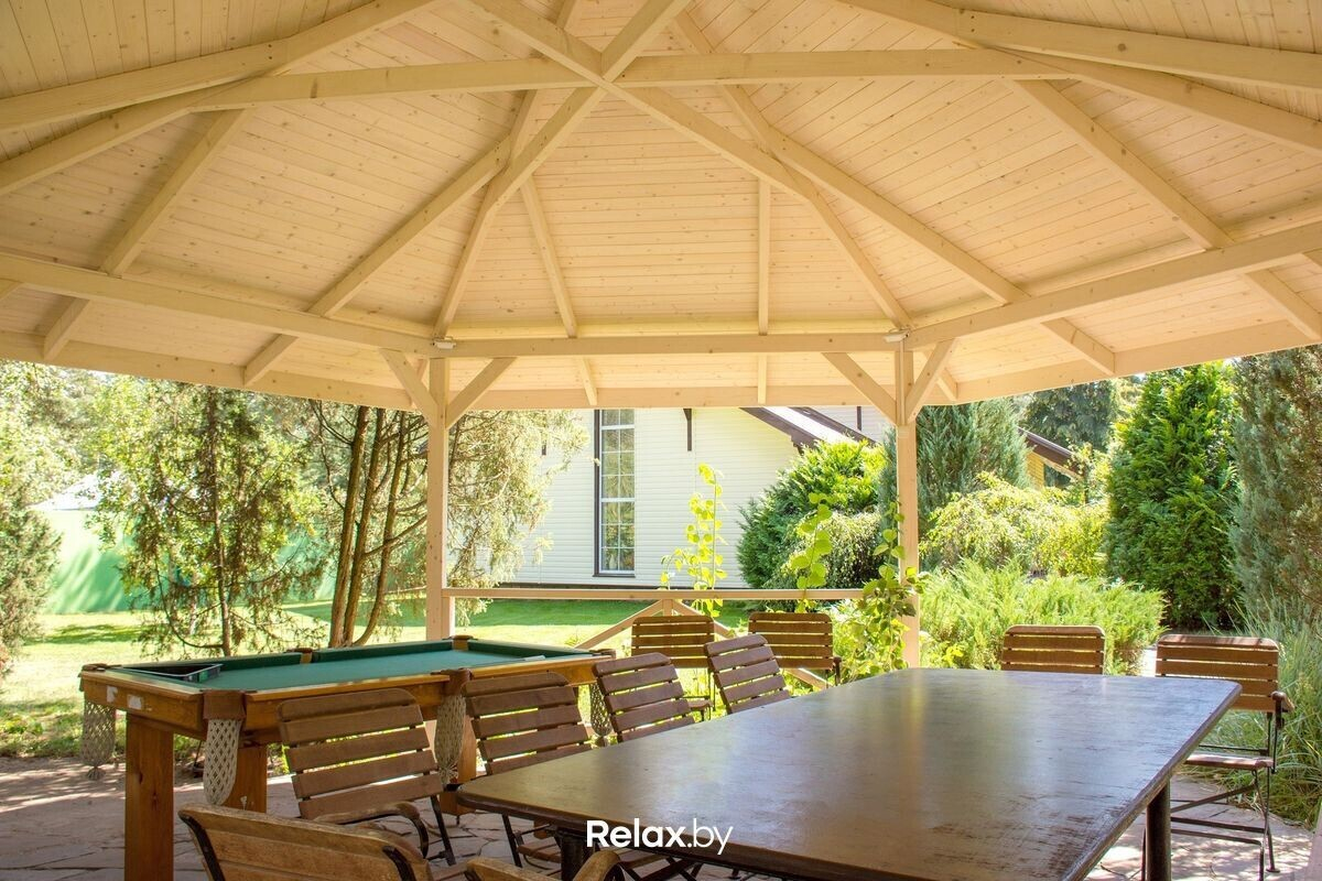 Рядом с каждым домом и на береговой линии — беседки. На территории базы есть баня с террасой (150 рублей за 3 часа). При ней находятся парная, душевая, санузел, комната отдыха, бильярд и настольный теннис. Компания до шести человек может отдохнуть и в бане-бочке.