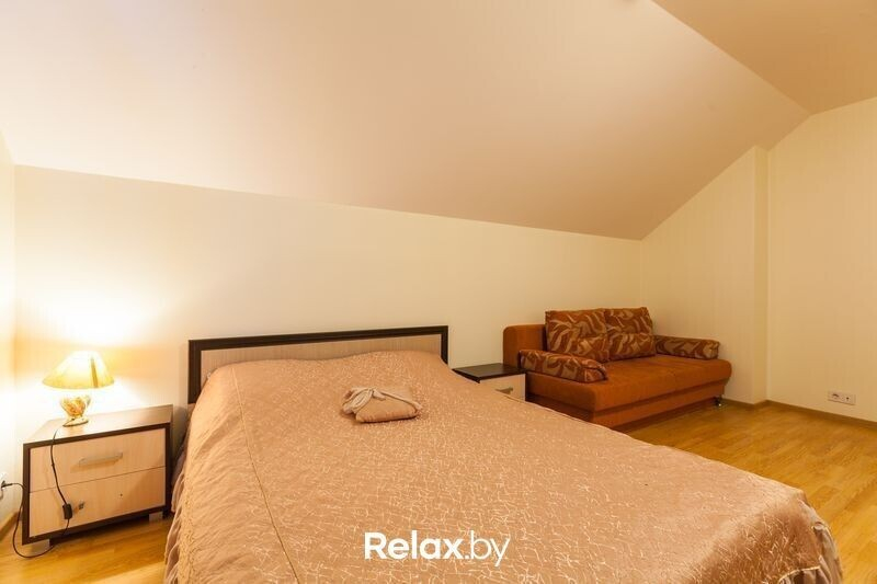 Коттедж на 10 спальных мест расположился в 500 метрах от озера Нарочь. Гостям предлагают проживание в трех современных комнатах. В доме есть кухня со всей необходимой техникой и гастрономическими комплиментами. Возможна организация питания по меню клиента (белорусская и европейская кухни).