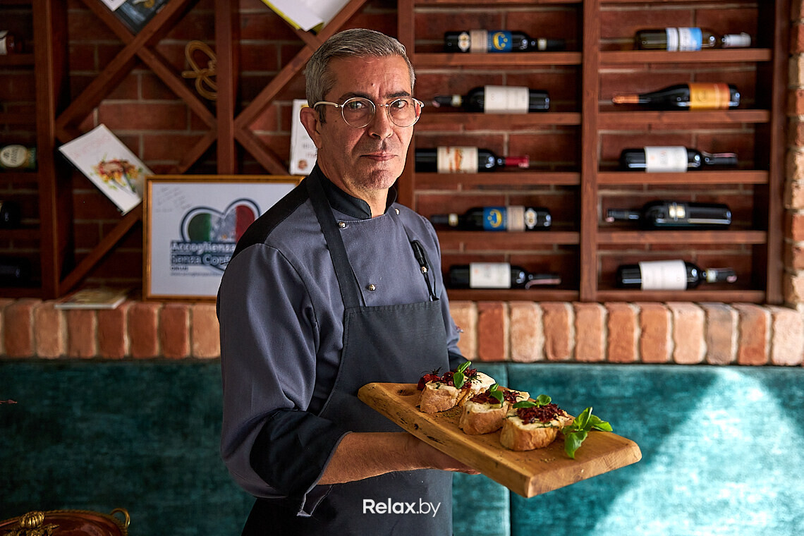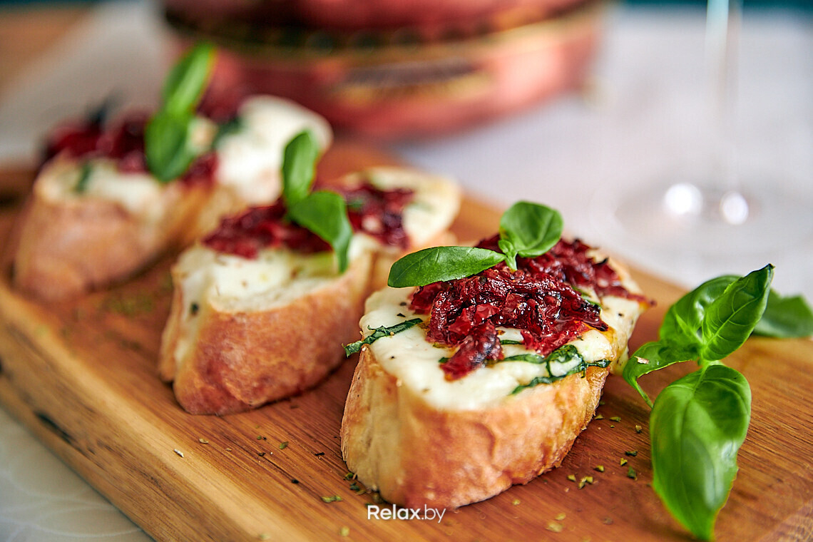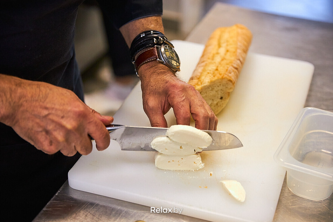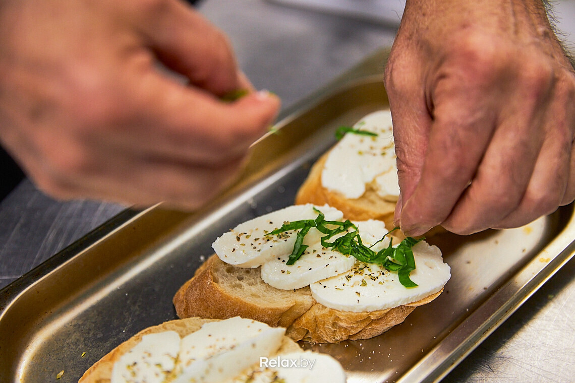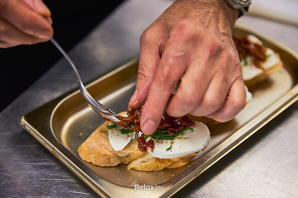 Клаудио показал, как приготовить классическую брускетту из вяленых томатов и моцареллы. На ломтики чиабатты или багета выкладываем кусочки моцареллы, перчим, посыпаем измельченным свежим (или молотым базиликом). Сверху выкладываем вяленые томаты, слегка сбрызгиваем оливковым маслом и отправляем в духовку на 4-5 минут при 240 градусах.