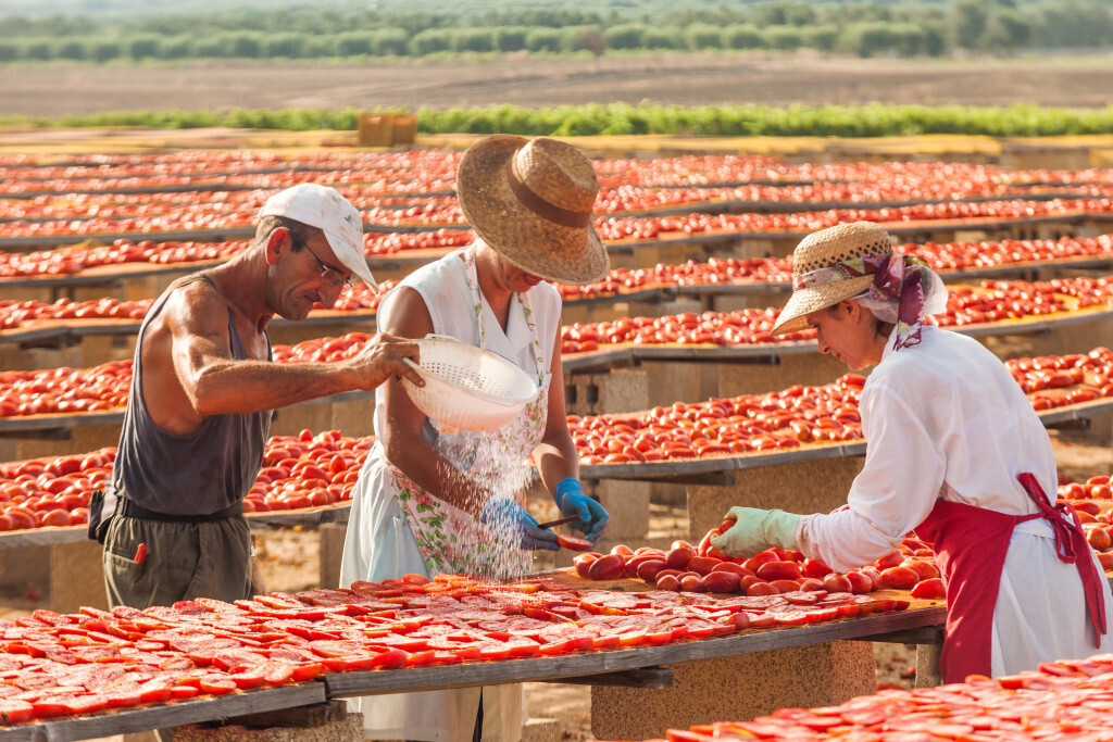 В Италии свежие разрезанные томаты выкладывают на большие противни из дерева, которые на ночь накрывают или прячут в сухих помещениях. В Сицилии весь процесс приготовления томатов под солнцем занимает от 3 до 7 дней. Сезон заготовок — июнь. В это время температура может достигать 38-40 градусов. Когда помидоры готовы, их для мягкости ошпаривают кипятком.