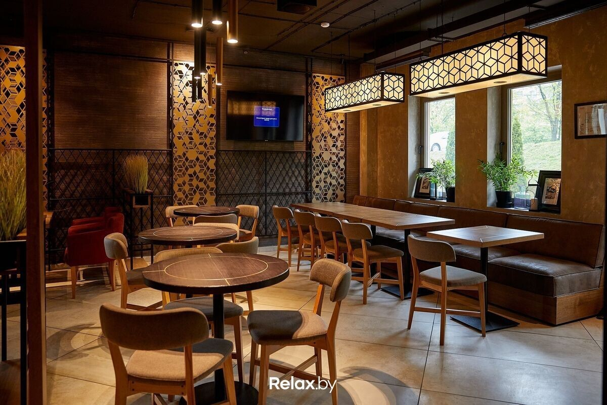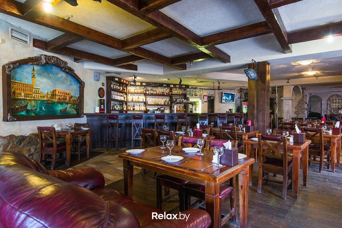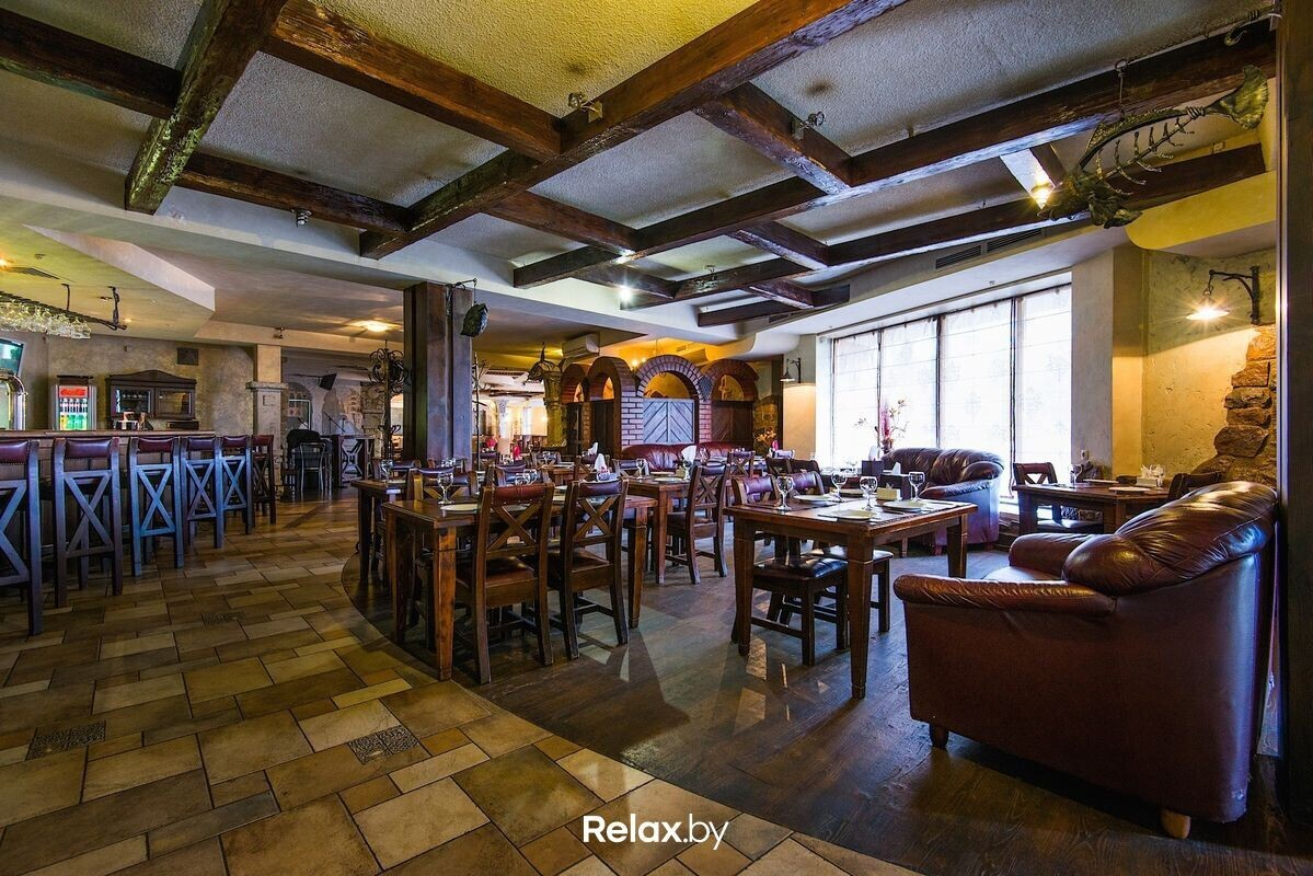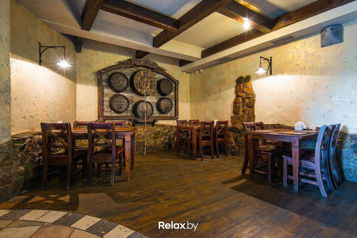 Основной зал «Таверны» вмещает до 160 гостей, два банкетных зала рассчитаны на 20 и 6 человек (подойдет для маленьких коллективов). В меню сочетание трех кухонь: европейской, белорусской и восточной. В интерьере — натуральный камень, дерево, кожа. Смягчает такую брутальность удачно подобранный текстиль и тематические картины. Важная информация для тех, кто решит заказать корпоратив: шоу-программа при брони банкета — бесплатно.