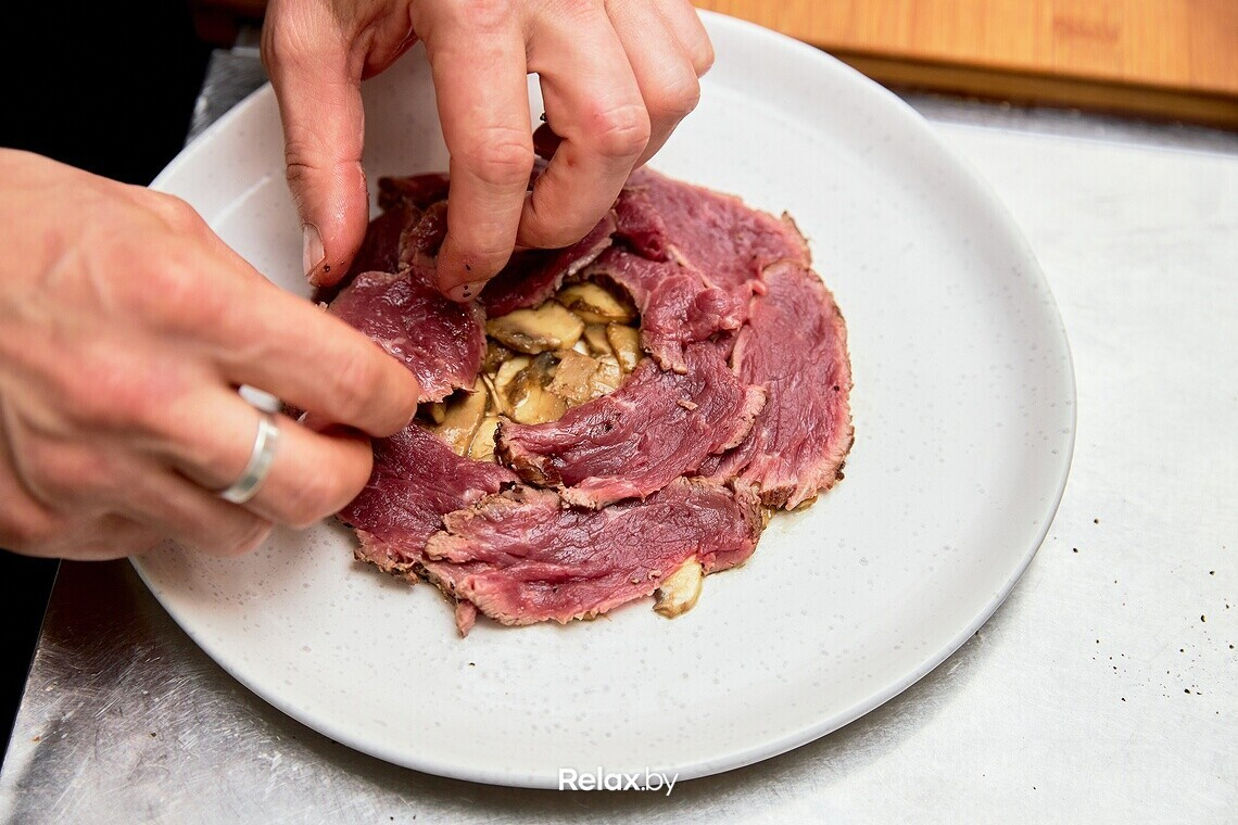 Нарезаем обжаренную говядину на тонкие ломтики и выкладываем поверх обжаренных грибов. Поливаем раскаленным оливковым маслом, предварительно посолив мясо. Тарелку шеф также рекомендует предварительно подогреть в духовке.