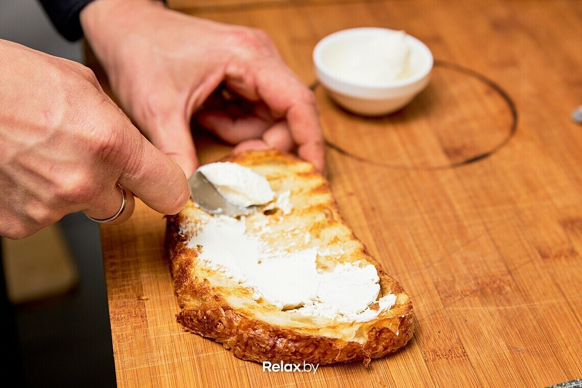 - Обжарить белый хлеб на сухой сковороде до хрустящей корочки. Сергей использует крафтовый хлеб на закваске: купить его сейчас не проблема, точки продаж есть в разных частях города. Можно использовать и обыкновенный хлеб из масс-маркета, но на вкусе закуски это определенно отразится не в лучшую сторону.