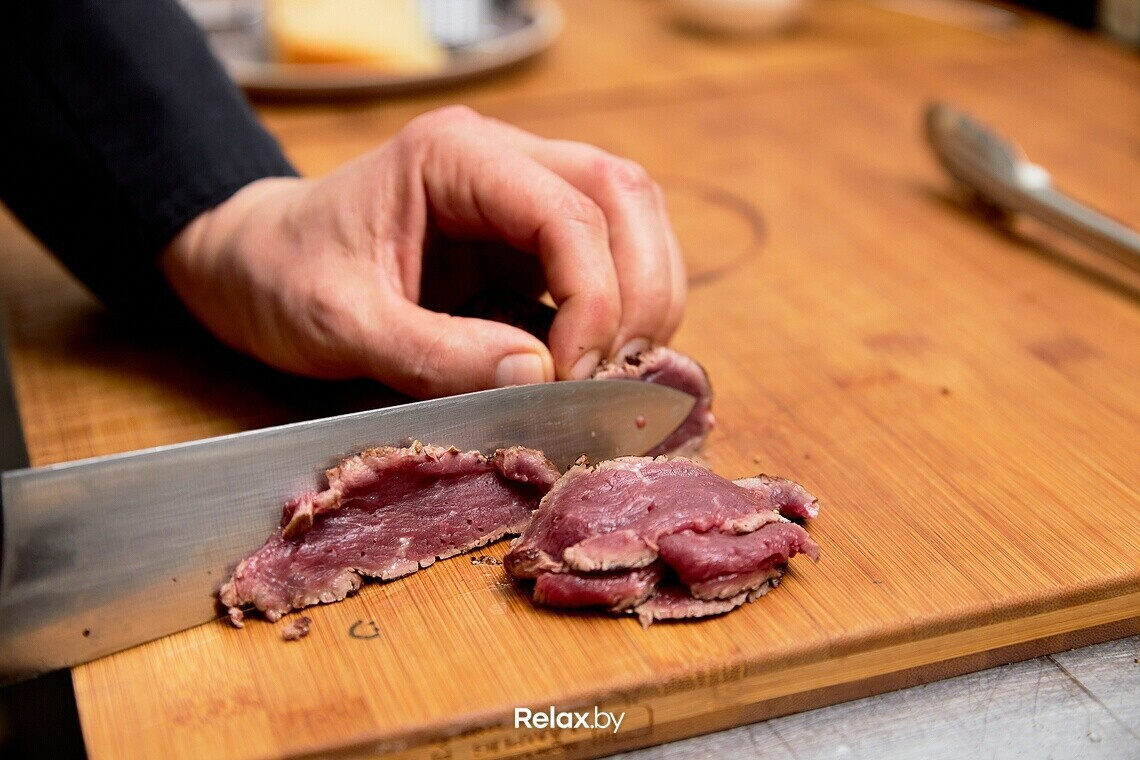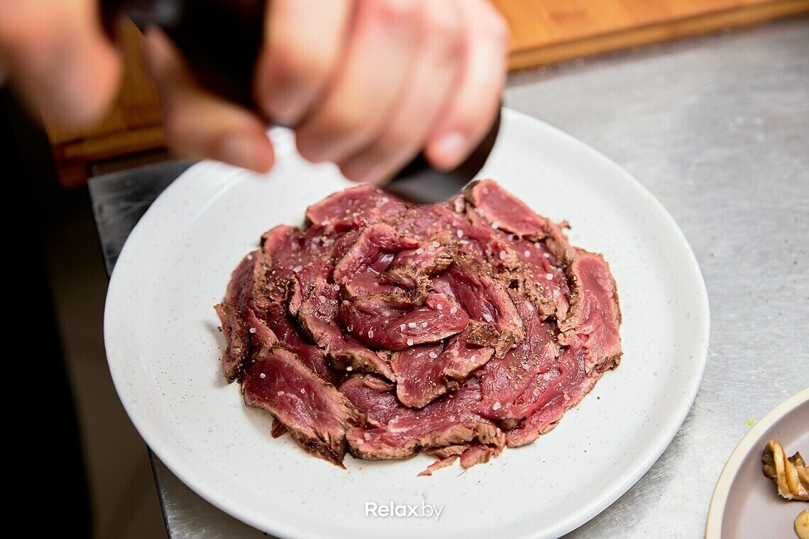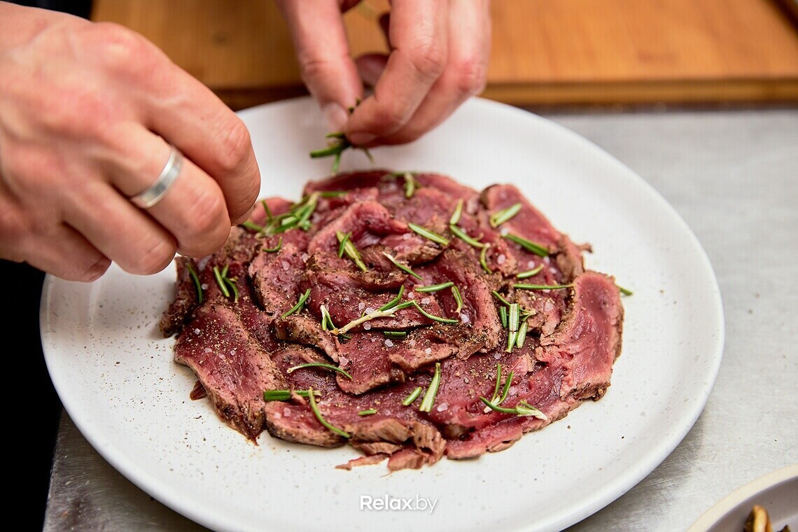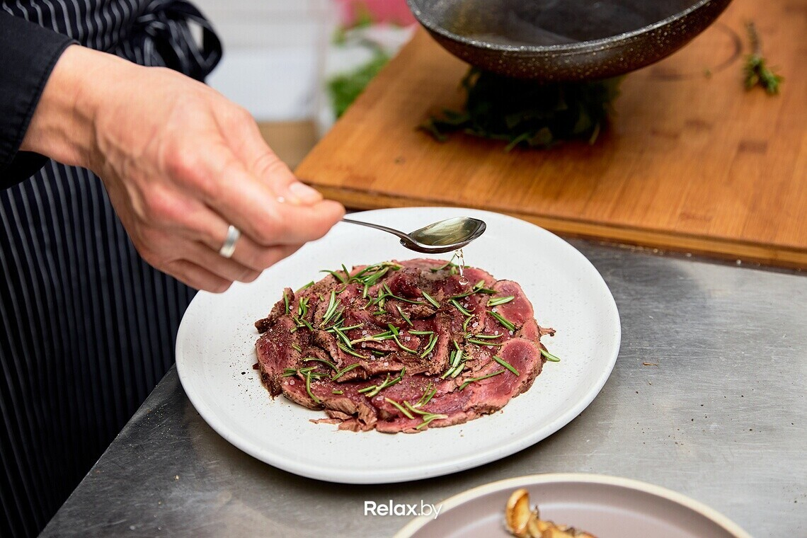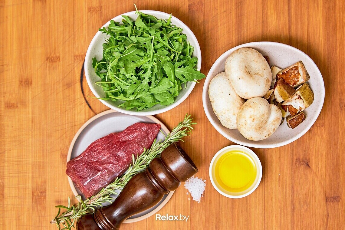 Нарезаем обжаренную говядину на тонкие ломтики и выкладываем поверх обжаренных грибов. Поливаем раскаленным оливковым маслом, предварительно посолив мясо. Тарелку шеф также рекомендует предварительно подогреть в духовке.