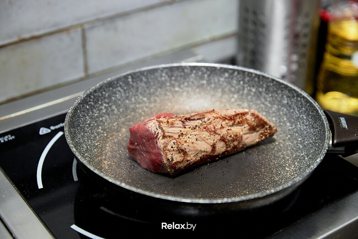 На этой же сковороде обжариваем кусок говядины, который вы предварительно зачистили, сбрызнули оливковым маслом и посыпали молотым перцем. Обжариваем, чтобы «запечатать» вкус и сок внутри куска.