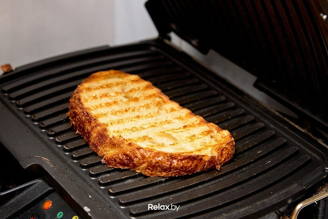 - Обжарить белый хлеб на сухой сковороде до хрустящей корочки. Сергей использует крафтовый хлеб на закваске: купить его сейчас не проблема, точки продаж есть в разных частях города. Можно использовать и обыкновенный хлеб из масс-маркета, но на вкусе закуски это определенно отразится не в лучшую сторону.