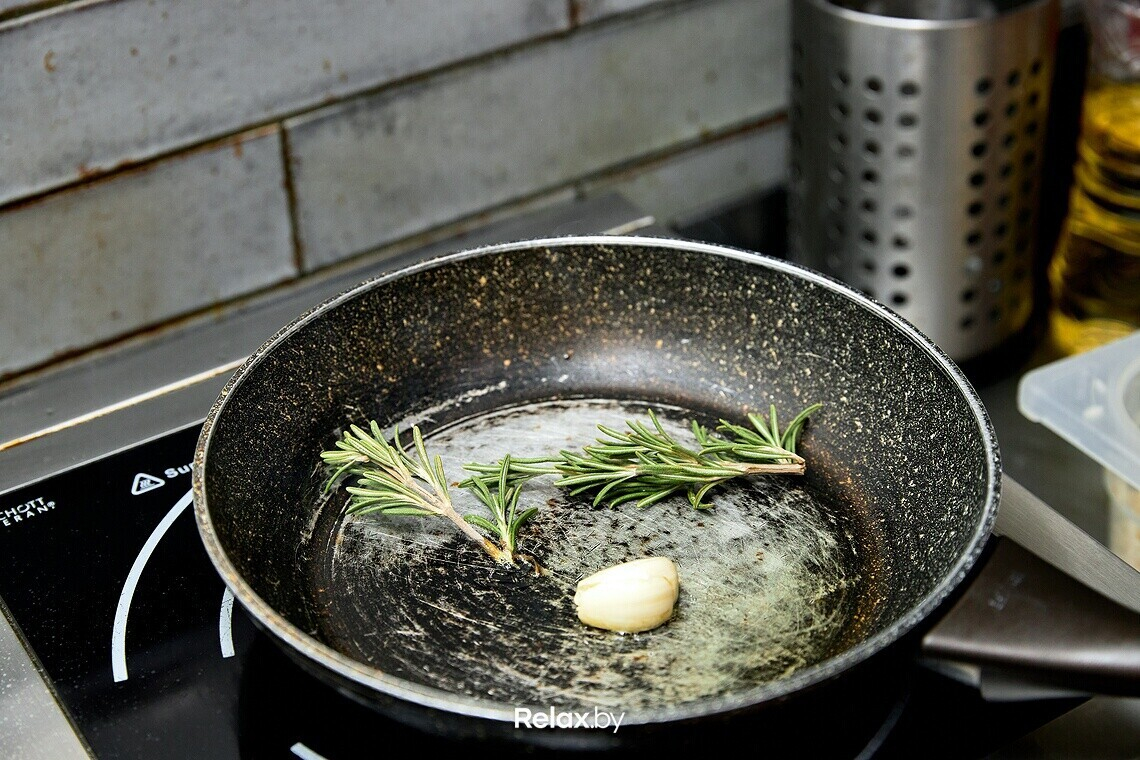 - На сковороде на небольшом количестве оливкового масла обжариваем лук, чеснок, ароматические травы. Если вы не любитель розмарина и тимьяна, не держите их на сковороде долго: достаточно, чтобы масло лишь слегка впитало аромат.