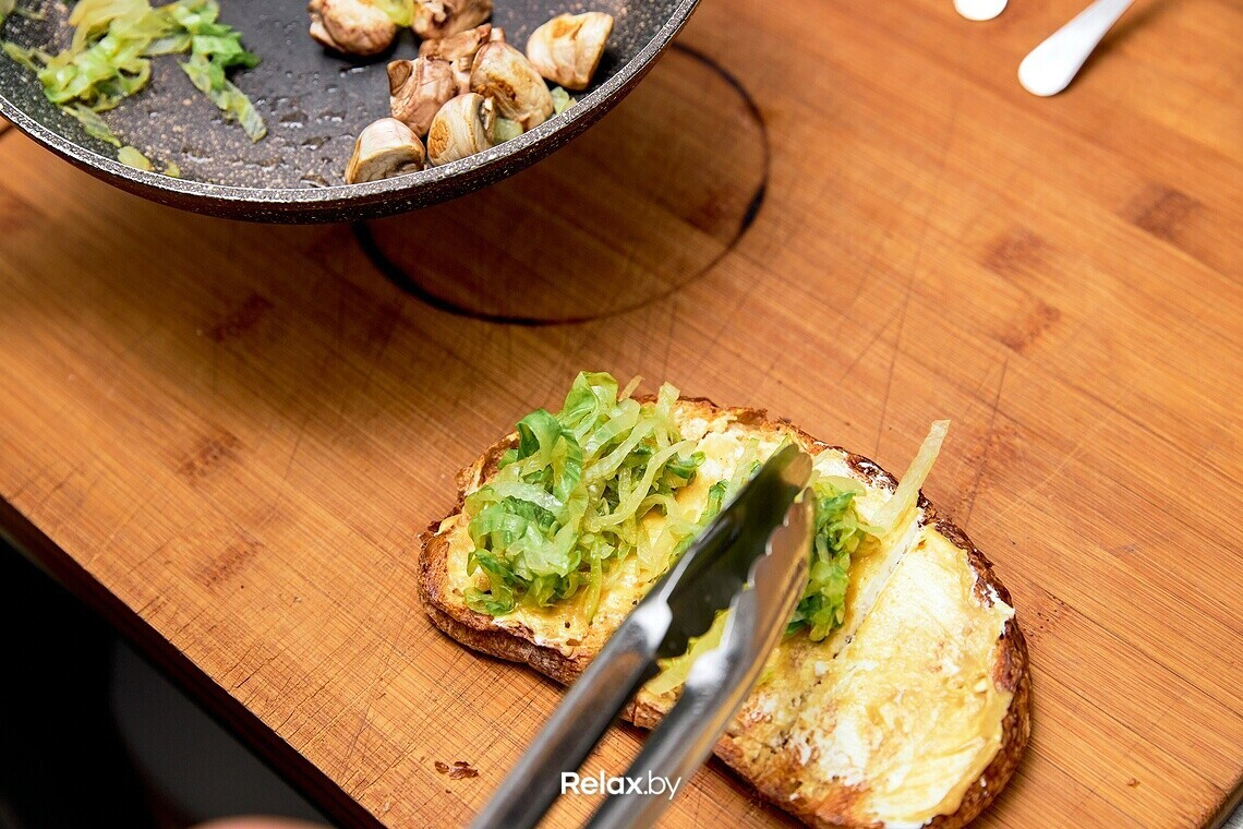 - Нарезаем салат Айсберг соломкой и подсушиваем на сухой горячей сковороде. Сергей отмечает, что после тепловой обработки он приобретает легкий ореховый привкус, отчего отлично сочетается с грибами. Выкладываем на хлеб, уже смазанный кремчизом и горчицей.