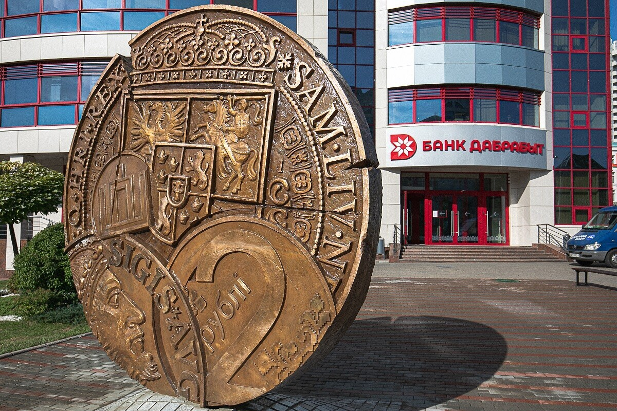 Скульптура установлена в сентябре в честь 20-летия банка. На обеих сторонах изображены деньги, которые были в обращении на белорусских землях со Средневековья и до наших дней: монеты ВКЛ, польские талеры, советские копейки и современные рубли.