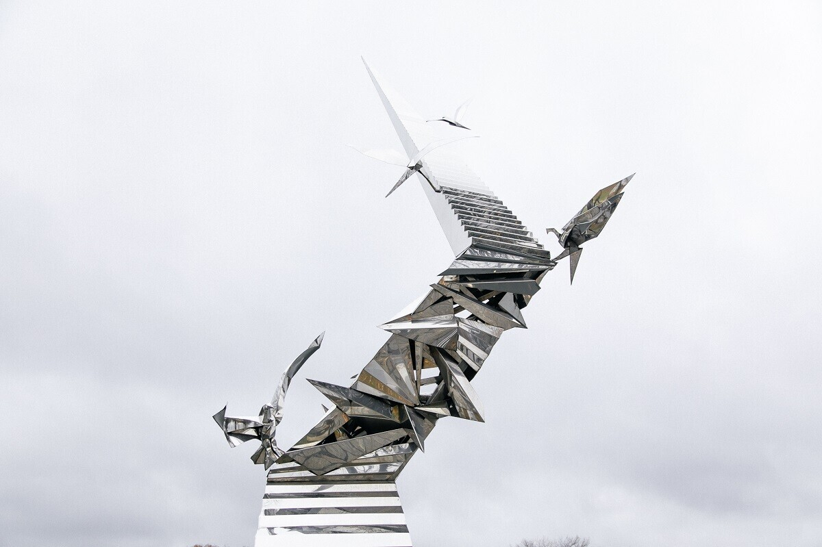 Чуть поодаль над водной гладью расположилась скульптура «Дорога в будущее». Необычная блестящая композиция, замечательная видовая точка, набережная реки — здесь красиво в любой сезон.