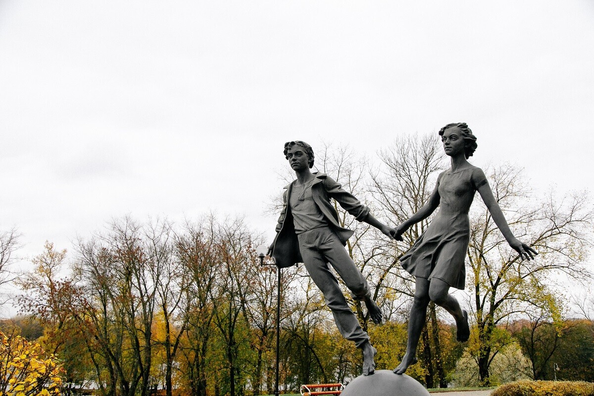 Чтобы сделать снимки, наполненные детской беспечностью, необязательно идти в парк аттракционов. Рядом с Комсомольским озером у входа во дворец молодежи есть скульптура держащихся за руки мальчика с девочкой на огромном шаре — счастливых и беззаботных.