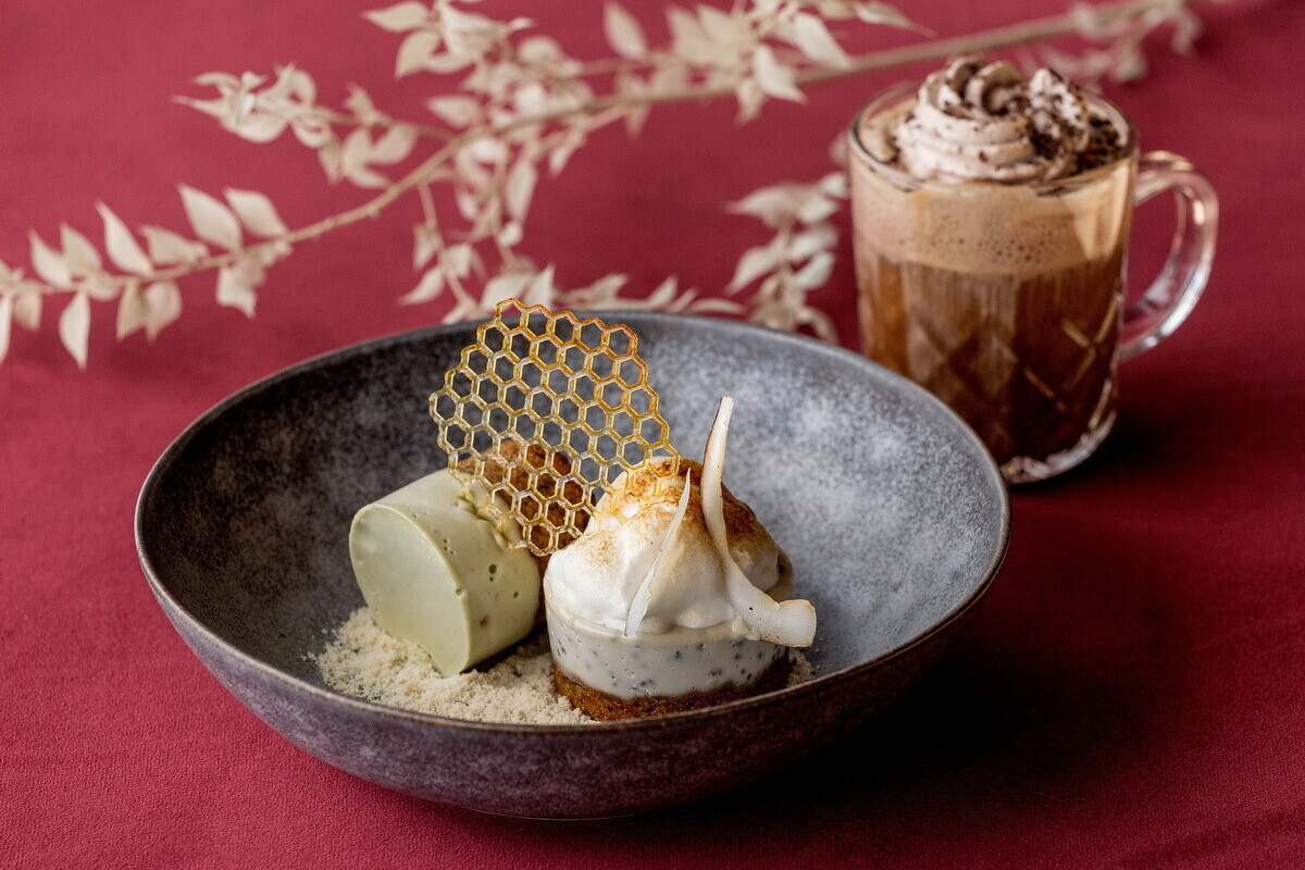 - Десерты из кешью-крема и основы из кекса с грецким орехом, 145 г (один десерт оттенен легким вкусом матчи. Второй — с семенами чиа и меренгой из аквафабы с кокосовыми чипсами. Объединяет оба десерта леденец в форме соты. Десерты веганские, без яиц и молока).