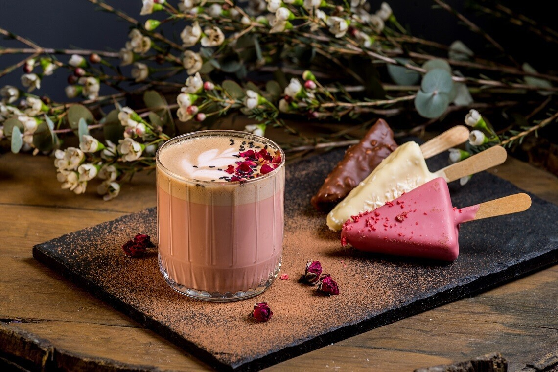 - «Цветочный капучино», 250 мл (при подаче напиток удивит оттенками розового «цветочного» молока в сочетании с черным кунжутом и нежными лепестками на пенной шапке. Привычный вкус классического напитка дополняет нежный и легкий вкус эссенции из лепестков роз и тонкий ванильный аромат. Цветочный капучино может быть выполнен на растительном молоке).