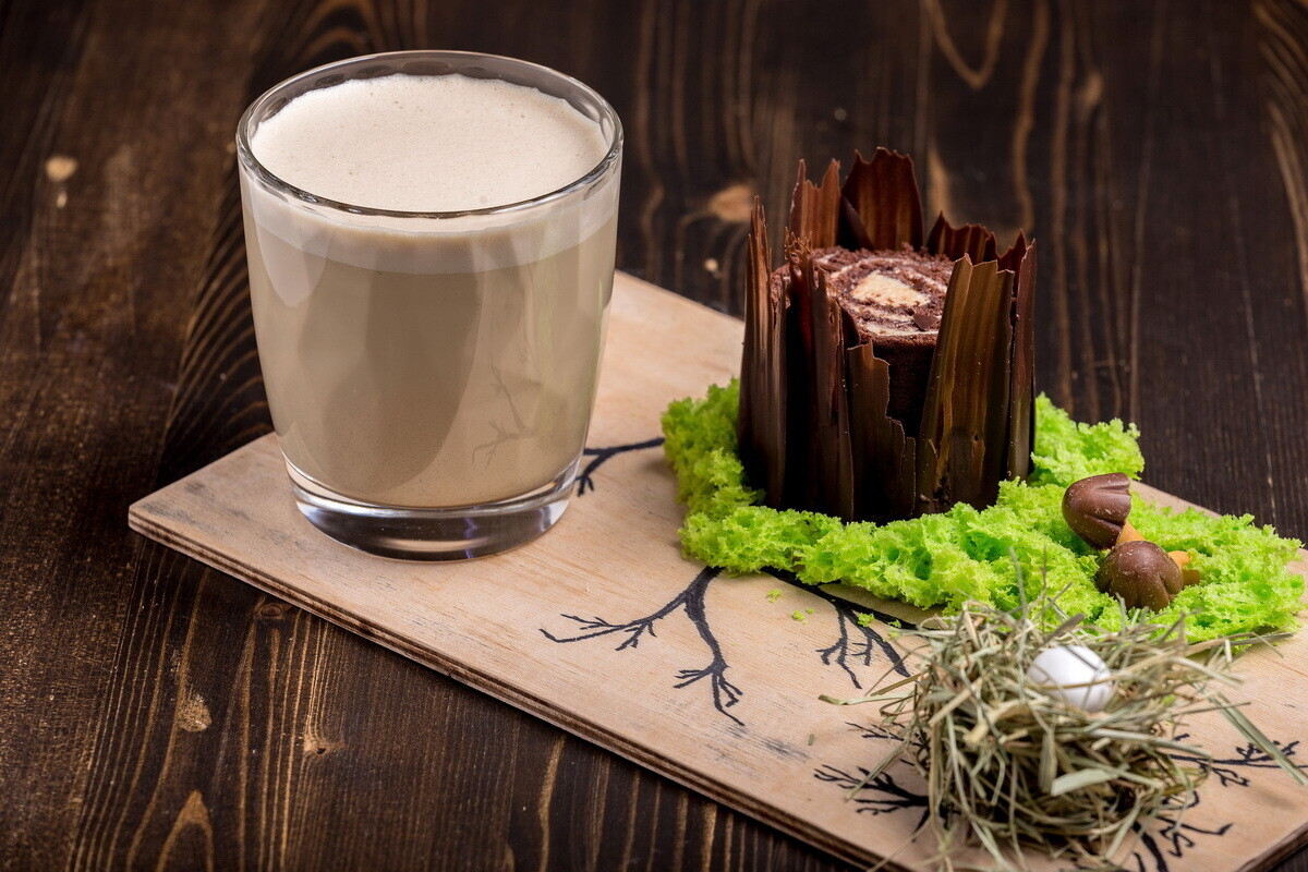- Банановый раф с шоколадной стружкой, 400 мл (чтобы подчеркнуть ноты молочного шоколада и тропических фруктов в послевкусии кофе, шеф-бармен добавляет в состав авторское банановое пюре).