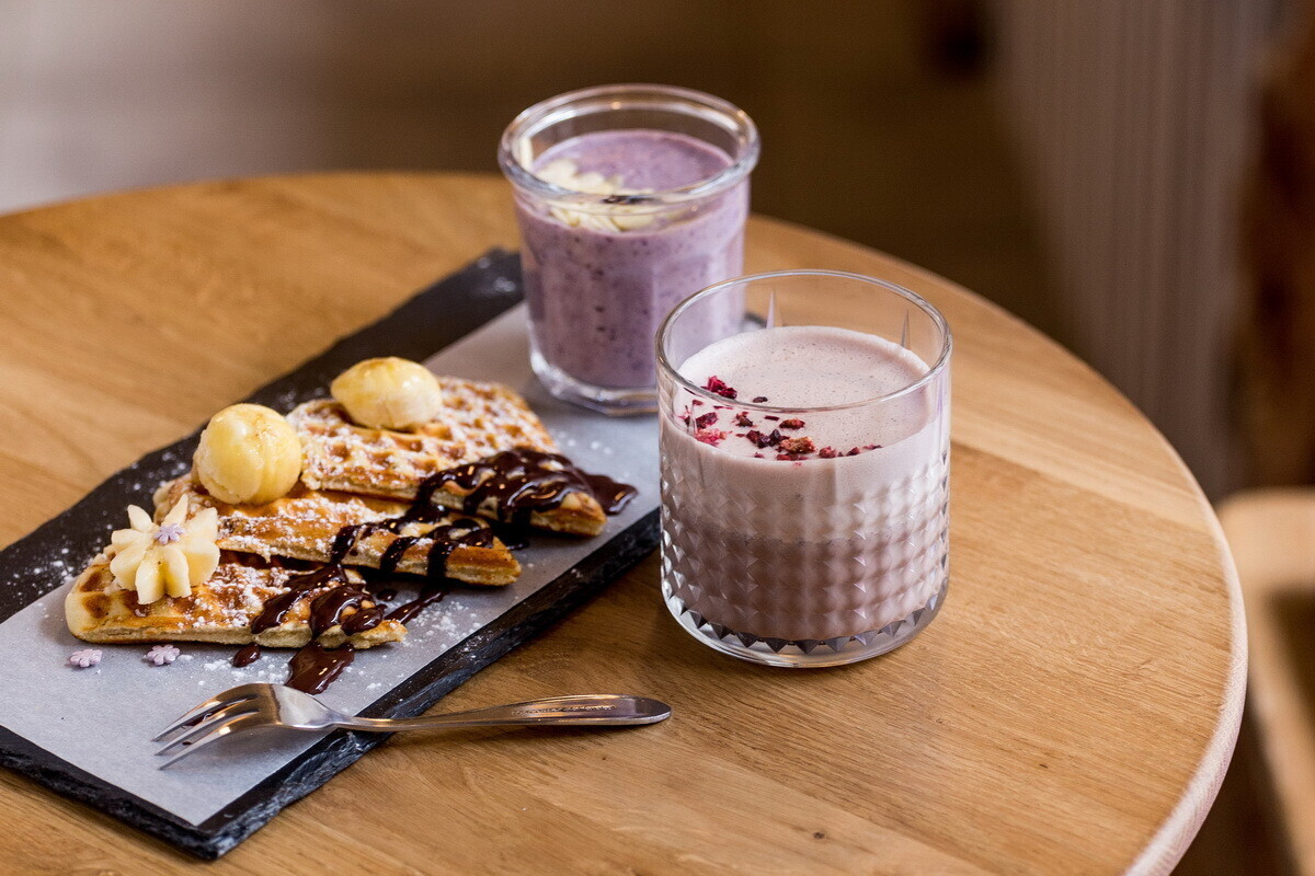 - Фирменные ванильно-сливочные вафли, 100/40/20 г (подаются с бананом и бельгийским шоколадом).