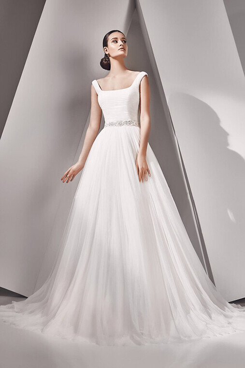 Каре — элегантный вырез квадратной или прямоугольной формы. Выделяет область декольте, делая свадебный образ женственным и утонченным. Визуально удлиняет шею. Может выглядеть чуть винтажно, так как в историческом костюме ассоциативно относится к эпохе Марии-Антуанетты.