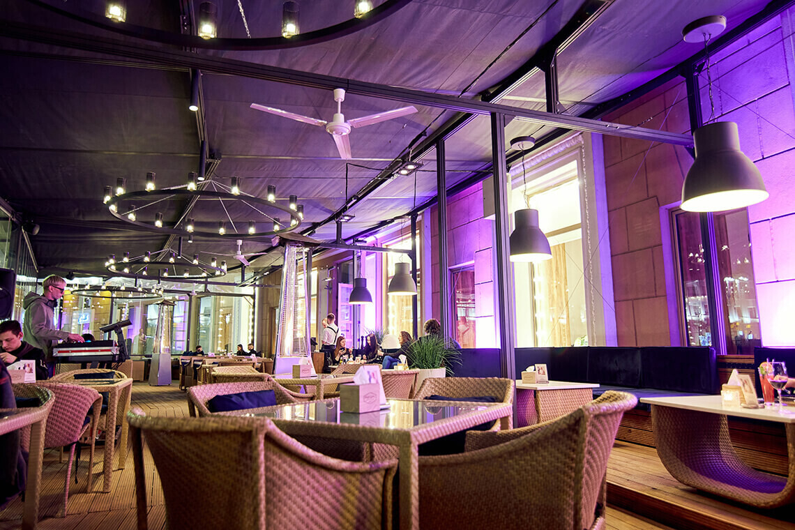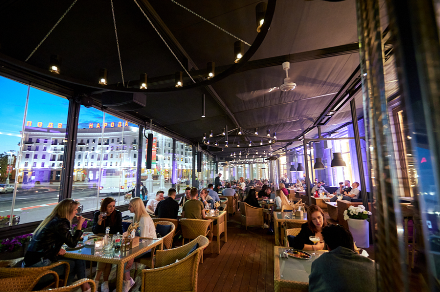 Террасу этого заведения можно назвать одной из самых больших в центре города, а сам ресторан легендарным для Минска. Бесспорное преимущество — панорамный вид на площадь Победы. Терраса обогревается и застеклена, поэтому здесь комфортно даже в прохладную погоду. В жаркий период включается кондиционер и распахиваются окна для лучшего обзора. На террасе могут расположиться до 115 человек. Дизайн, свет и декорации подобраны таким образом, чтобы фотографии получались сочными и живыми. Расположиться можно как за столом с креслами, так и компанией на больших мягких диванах. В меню каждый найдет что-то по вкусу: начиная с домашней пасты, и заканчивая большим выбором морепродуктов. Каждый вечер с понедельника по воскресенье на террасе живую музыка и dj set.