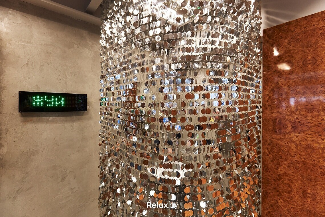 Интерьером занималась группа беларусских дизайнеров из Studio 11. И, по словам Александры, у их проекта не было ни единой правки. Зал кафе маленький, буквально пару столиков с объединенными сидениями, барная стойка. Главное, что бросается в глаза, — блестящая шторка, отделяющая зал от санзоны.