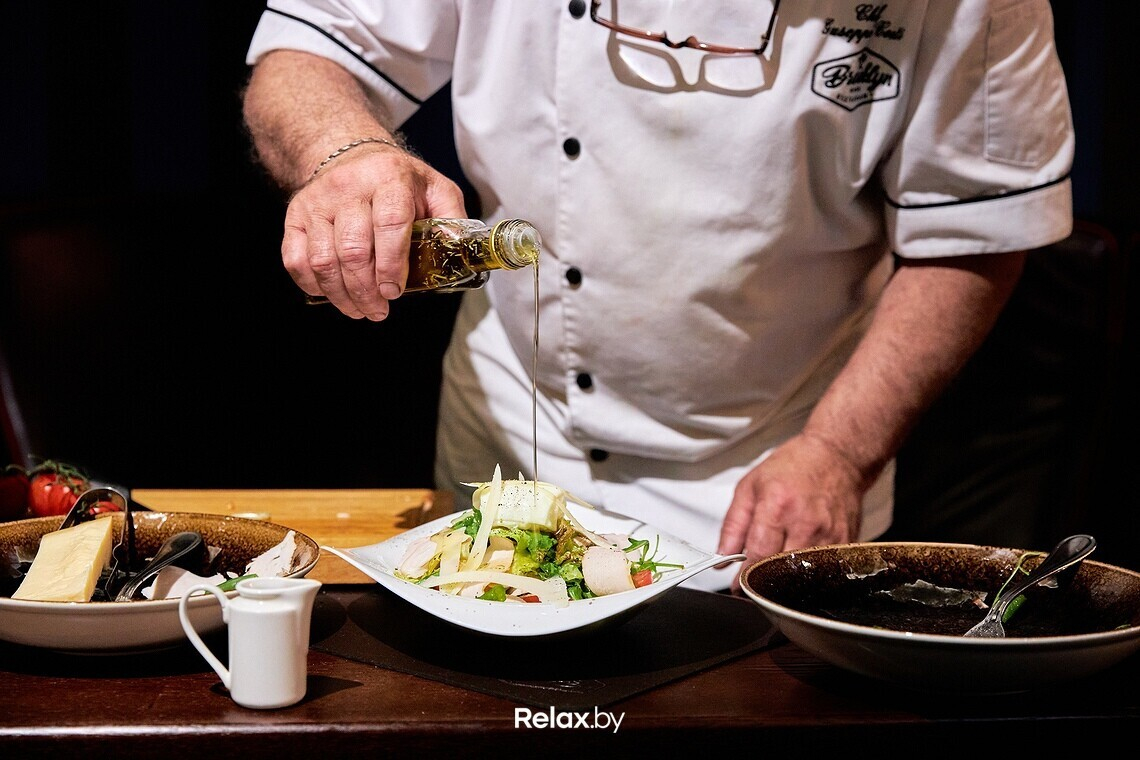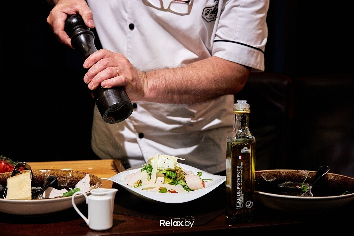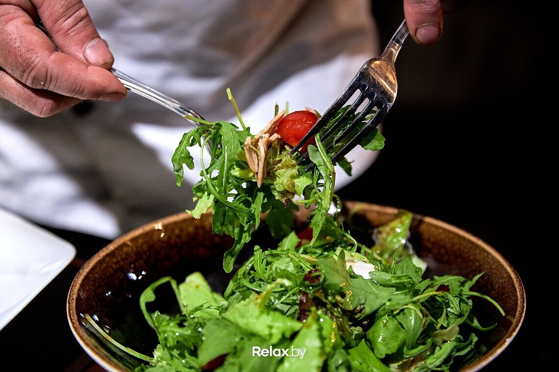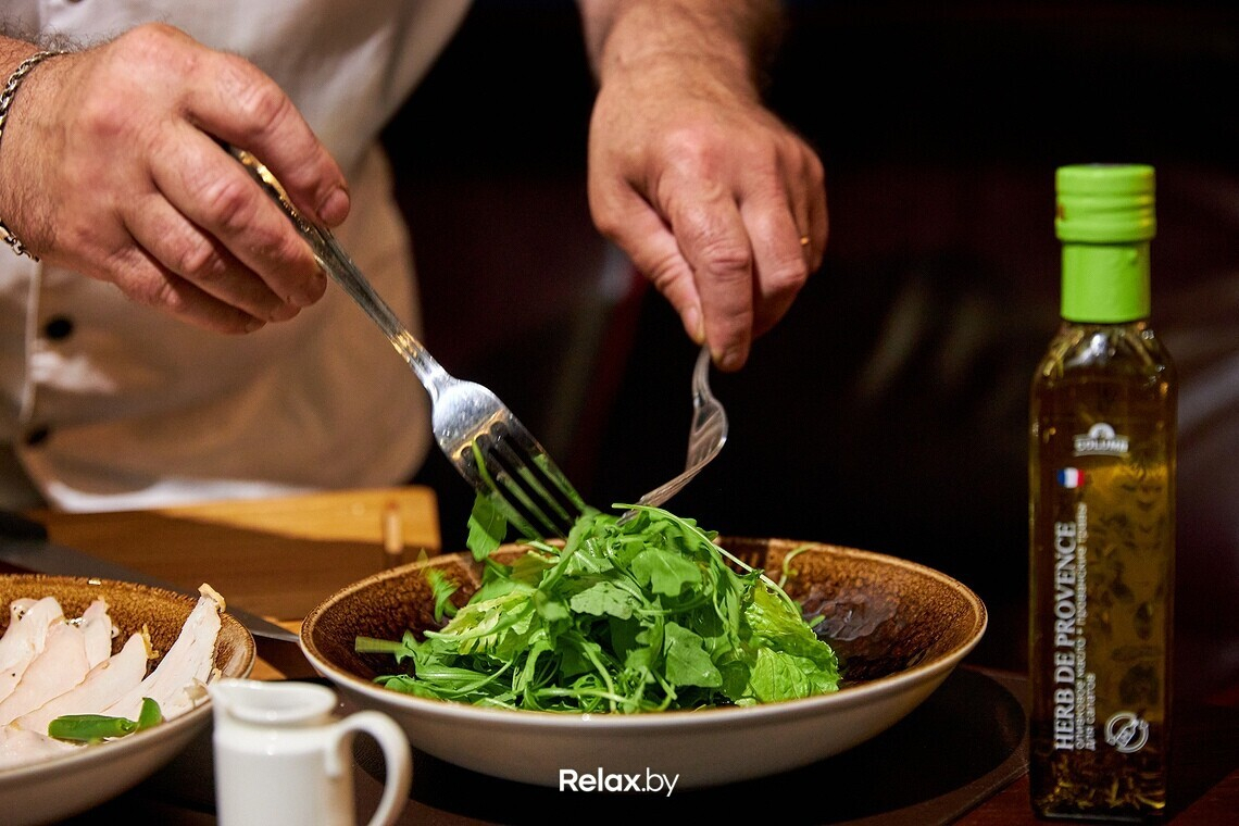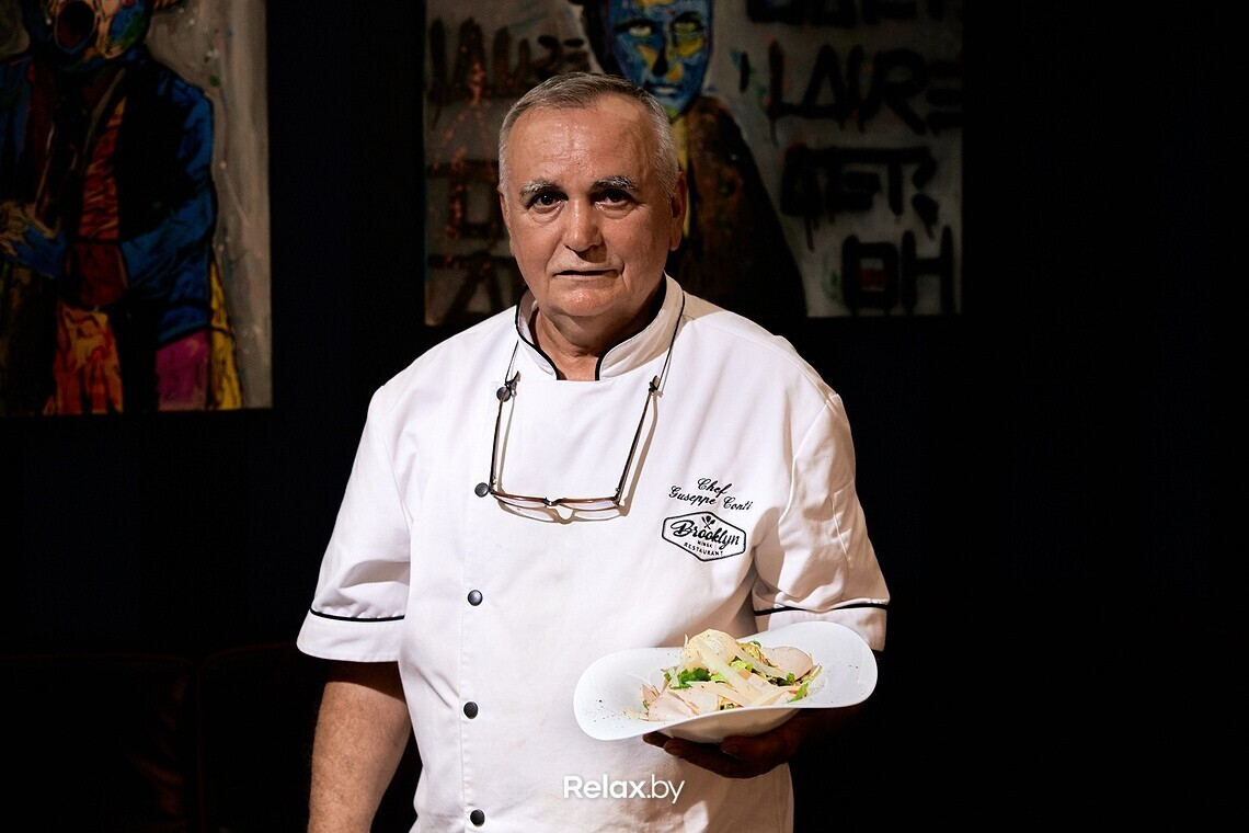 Первый салат готовим с шеф-поваром ресторана «Бруклин» Джузеппе Конти. Он родом из Италии, но за свою профессиональную карьеру объехал весь мир: от Нью-Йорка до Берлина. Конечно, готовит и французскую кухню, многие техники которой лежат в основе гастрономии.