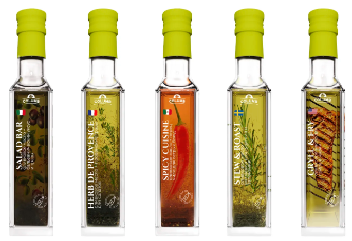 Коллекция оливковых масел Columb — это гастрономические путешествия в пять стран мира: Францию (оливковое масло Herb de Provence), Мексику (Spicy cuisine), Швецию (Stew & Roast), Италию (Salad bar) и США (Grill & Fry).