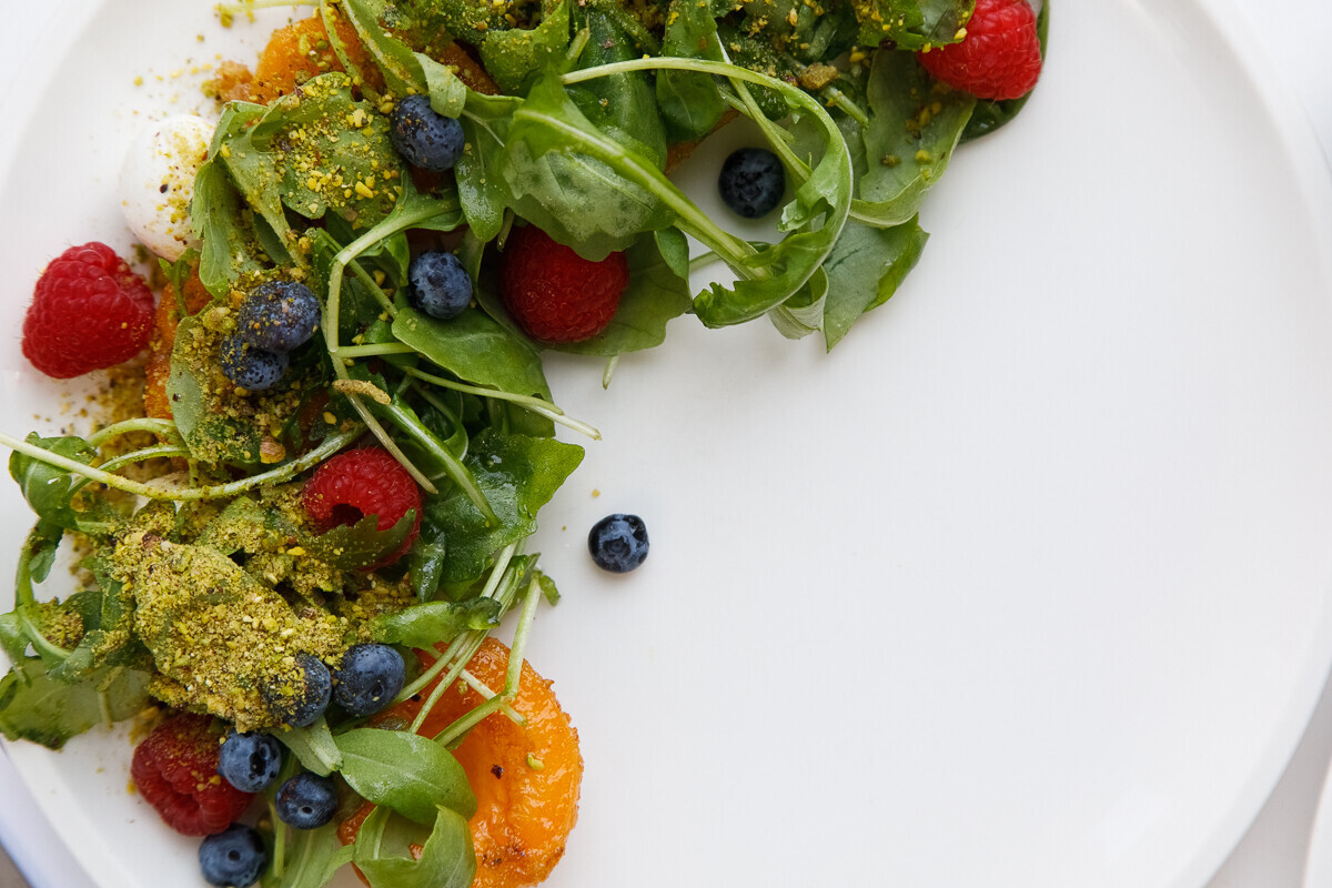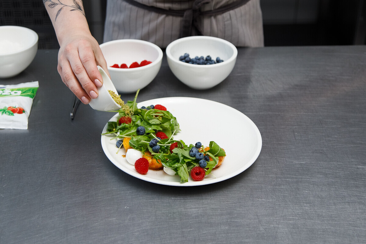 4. Выкладываем ягоды и щедро посыпаем салат фисташковой крошкой, которую несложно сделать с помощью блендера. Фисташка может быть и цельной, но именно крошка, по словам Анны, будет отлично «заигрывать» с рецепторами, обволакивая фрукты и зелень в тарелке.